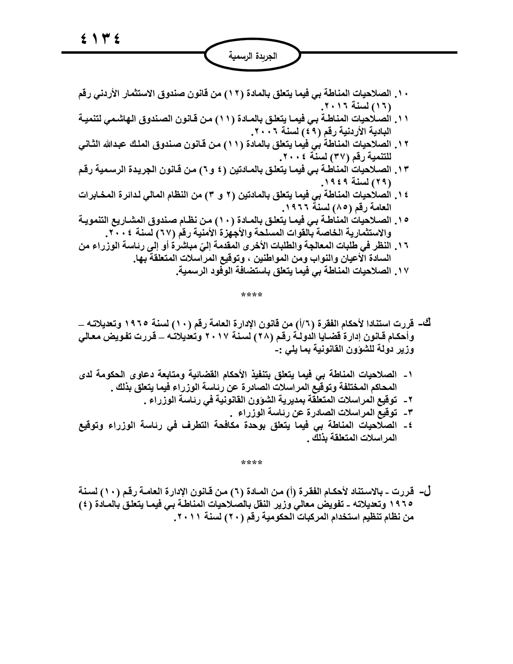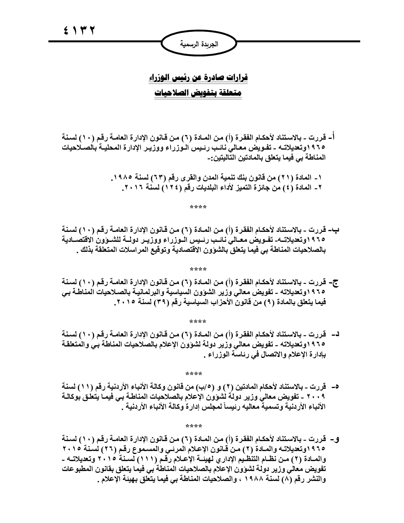 القبة نيوز - قرر رئيس الوزراء الدكتور بشر الخصاونة تفويض عدد من الوزراء بالصلاحيات المناطة به، وفق عدد الجريدة الرسمية الصادر الثلاثاء.