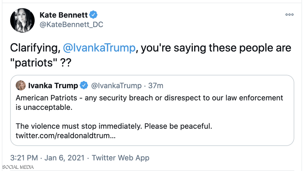 ومع تصاعد الأحداث غردت إيفانكا قائلة: "أيها الوطنيون الأميركيون. أي خرق أمني أو عدم احترام للقانون غير مقبول. يجب أن يتوقف العنف على الفور. من فضلكم كونوا سلميين".
