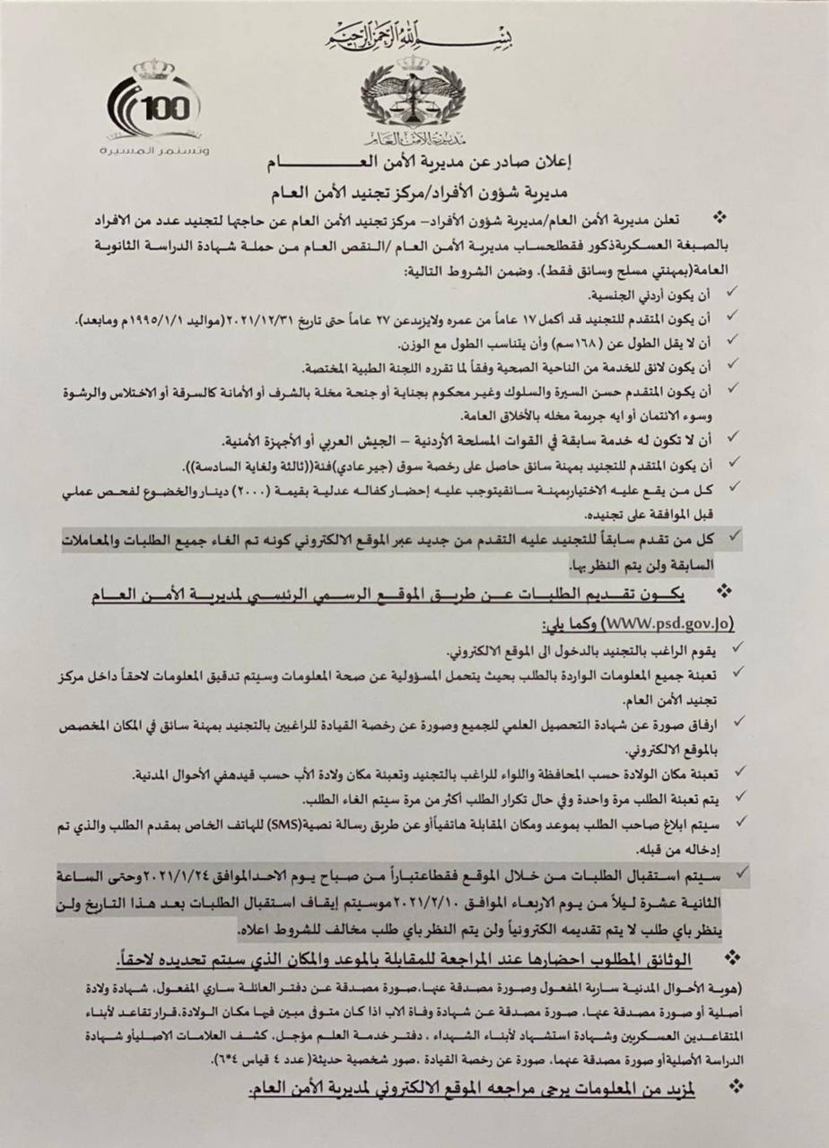القبة نيوز- أعلنت مديرية الأمن العام/ مديرية شؤون الأفراد – مركز تجنيد الأمن العام عن حاجتها لتجنيد عدد من الافراد بالصبغة العسكرية ذكور فقط لحساب مديرية الأمن العام.