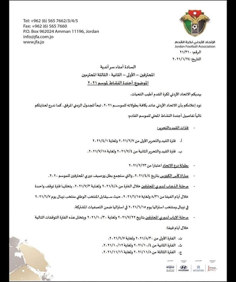 القبة نيوز- أعلن الإتحاد الإردني لكرة القدم أجندة نشاطاته للموسم المقبل.