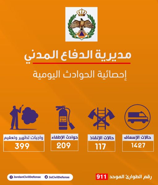 وقالت المديرية في بيان لها، السبت، إنه تم التعامل مع (117) حادث إنقاذ و(209) حادث إطفاء, بالإضافة إلى تعقيم وتطهير (399) مركبة ومنشاة وموقع في مختلف المحافظات, وذلك من خلال فريق المواد الخطرة.
