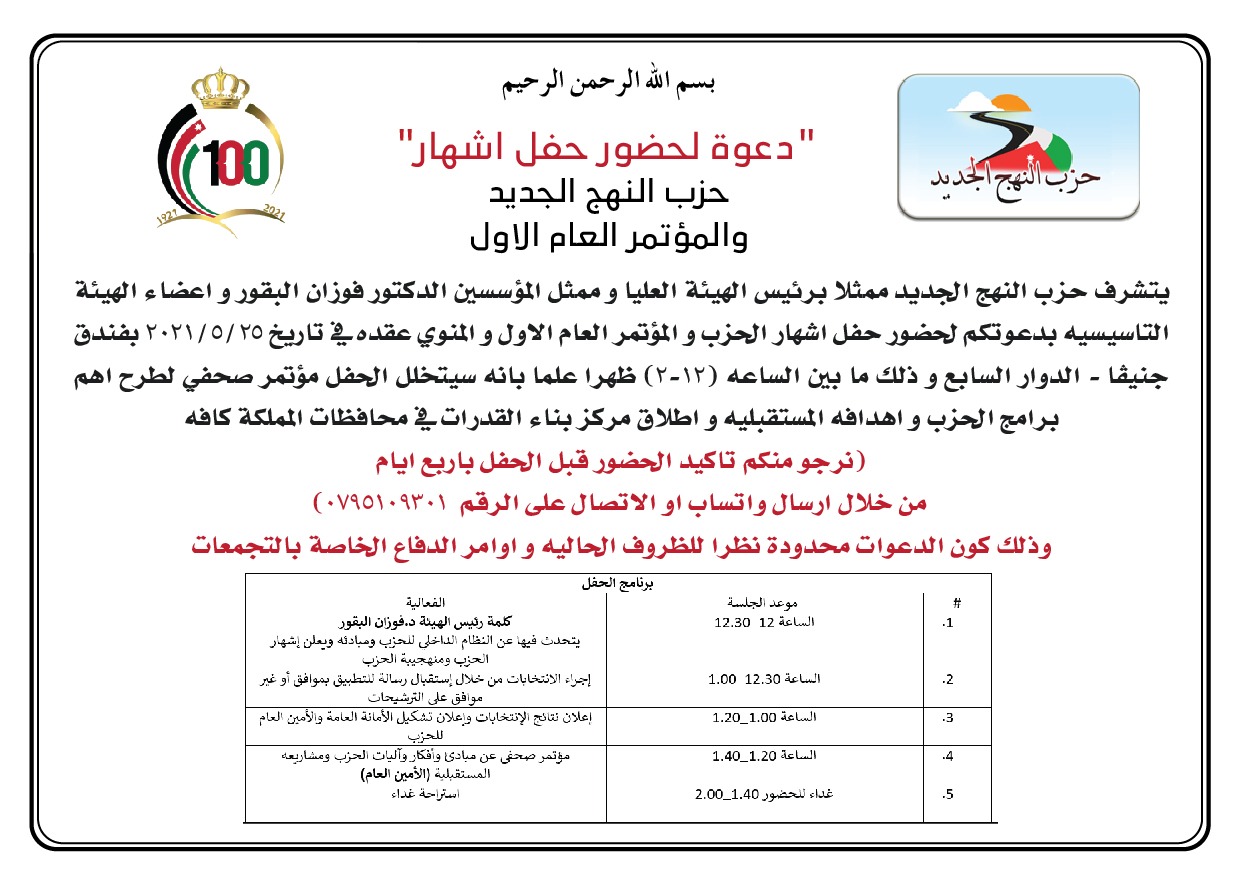 ويعقد مؤسسو الحزب مؤتمرا صحافيا للاعلان عن برنامج الحزب وأهدافه المستقبلية، اضافة الى اطلاق مركز القدرات التابع للحزب في مختلف محافظات المملكة.