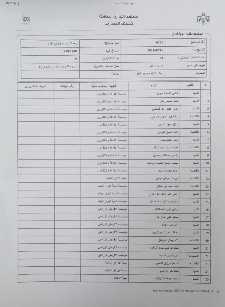 وقدم الدورة الأستاذ المدرب محمد الرعود واشرف عليها اداريا دعاء العنوز وشارك فيها 25 موظفة وموظفا عاما من عدة مؤسسات حكومية هي: مؤسسة الإذاعة والتلفزيون الأردني، ومؤسسة الإقراض الزراعي، ومؤسسة تنمية أموال الأيتام، وهيئة الأوراق المالية ومعهد الإدارة العامة.