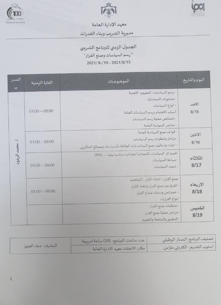 القبة نيوز- اختتمت، الخميس، الدورة التدريبية التي نظمها معهد الإدارة العامة الحكومي الأردني لمدة أسبوع في الفترة ما بين 15 الى 19 آب تحت عنوان رسم السياسات وصنع القرار، وذلك عبر تقنية الاتصال المرئي.