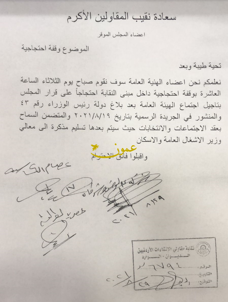 وارسل مجموعة من المقاولين مذكرة يدعوون فيها إلى وقفة احتجاجية داخل مبنى النقابة يوم الثلاثاء الساعة العاشرة صباحا معتبرين قرار المجلس مخالفة لقانون نقابة المقاولين، ومخالفة لنص أمر الدفاع البلاغ رقم ٤٣.