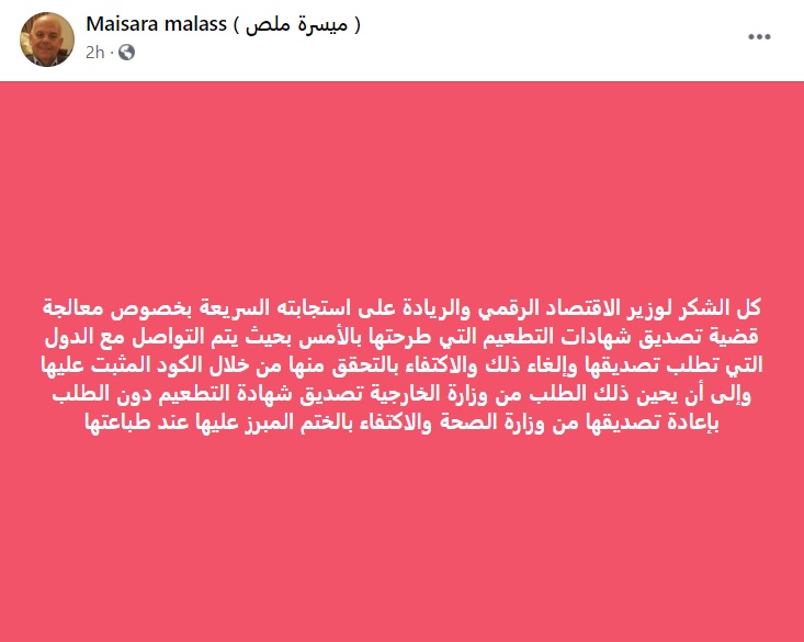 وأضاف ملص أن وزير الاقتصاد الرقمي أبلغه بمعالجة الأمر بحيث يتم التواصل مع الدول التي تطلب تصديق شهادة المطعوم وإلغاء ذلك والاكتفاء بالتحقق منها من خلال الكود المثبت عليها.