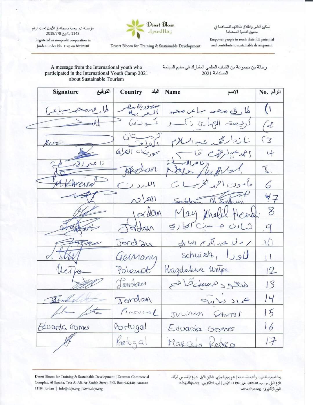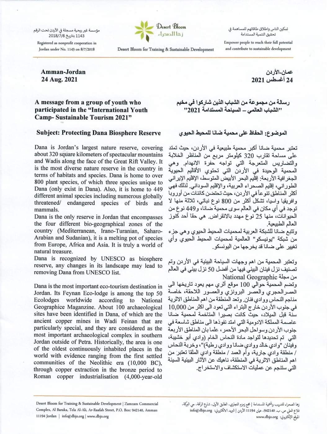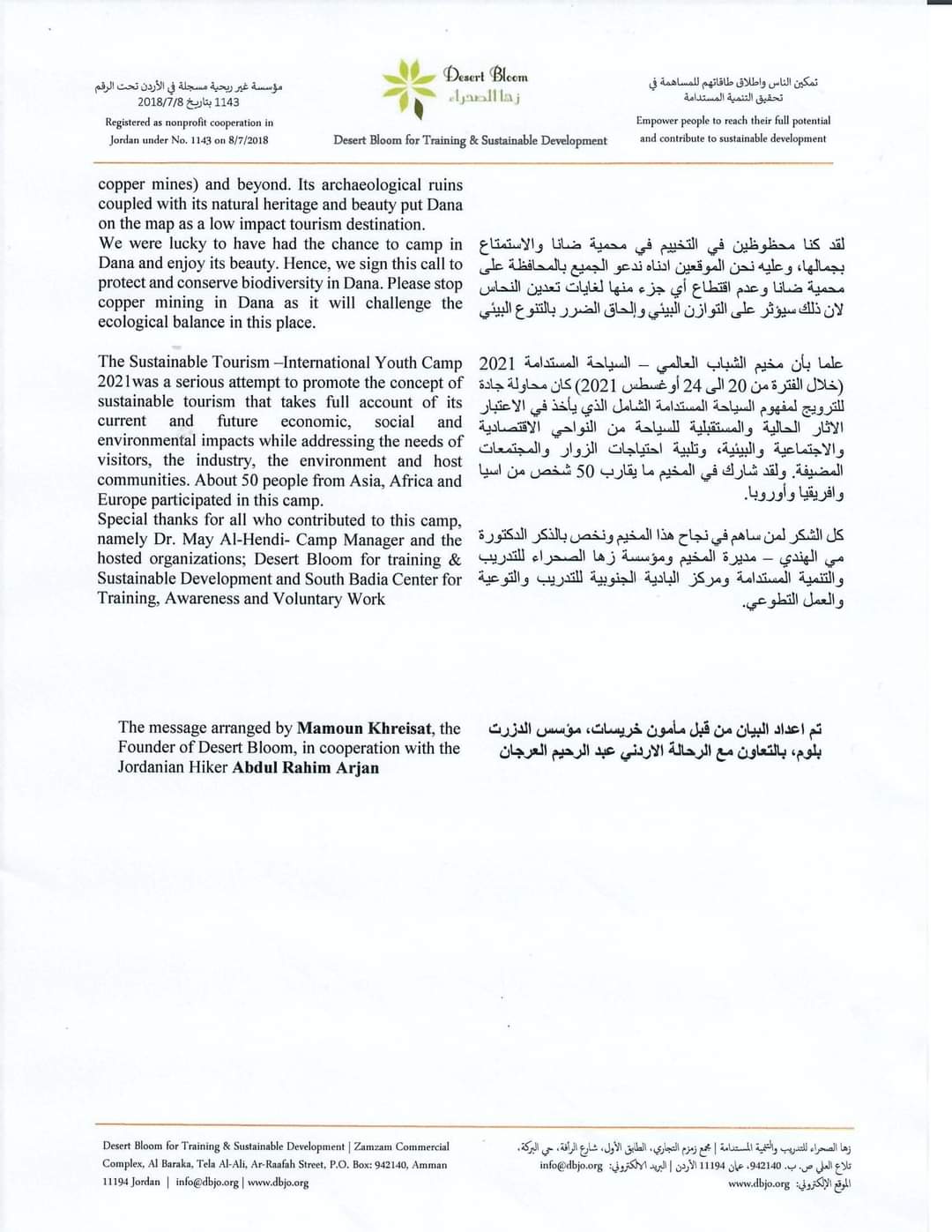 وجاء في البيان الذي أعده مؤسس الدزرت بلوم مأمون خريسات، والرحالة الاردني عبد الرحيم العرجان، ووقعه مشاركون في المخيم من مختلف دول العالم، ما يلي: