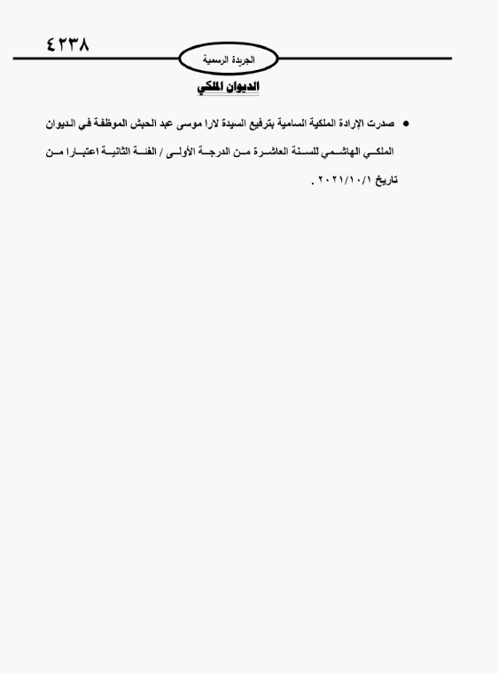 كما صدرت الإرادة الملكية السامية بترفيع لارا موسى عبد الحبش الموظفة في الديوان الملكي الهاشمي للسنة العاشرة من الدرجة الأولى - الفئة الثانية اعتبارا من تاريخ 1-10-2021.