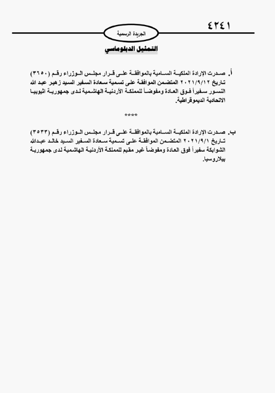 كما صدرت الإرادة الملكية السامية بالموافقة على قرار مجلس الوزراء المتضمن الموافقة على تسمية السفير خالد عبدالله الشوابكة سفيراً فوق العادة ومفوضاً غير مقيم للمملكة الأردنية الهاشمية لدى جمهورية بيلاروسيا.