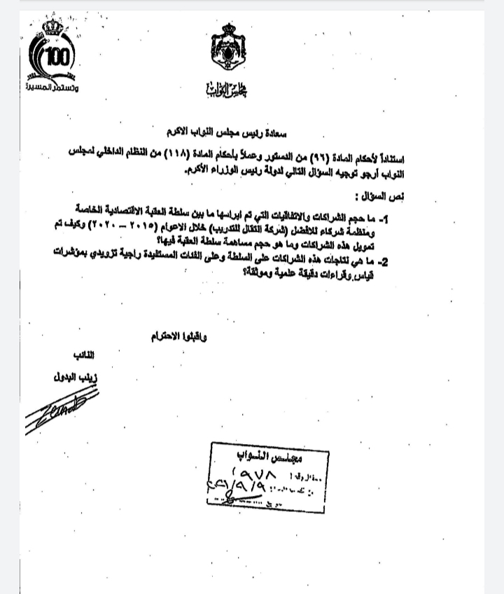 القبة نيوز - وجهت النائب زينب البدول عددا من الأسئلة المتعلقة بطبيعة الشراكة القائمة ما بين سلطة العقبة الاقتصادية الخاصة ومنظمة (شركاء للأفضل).