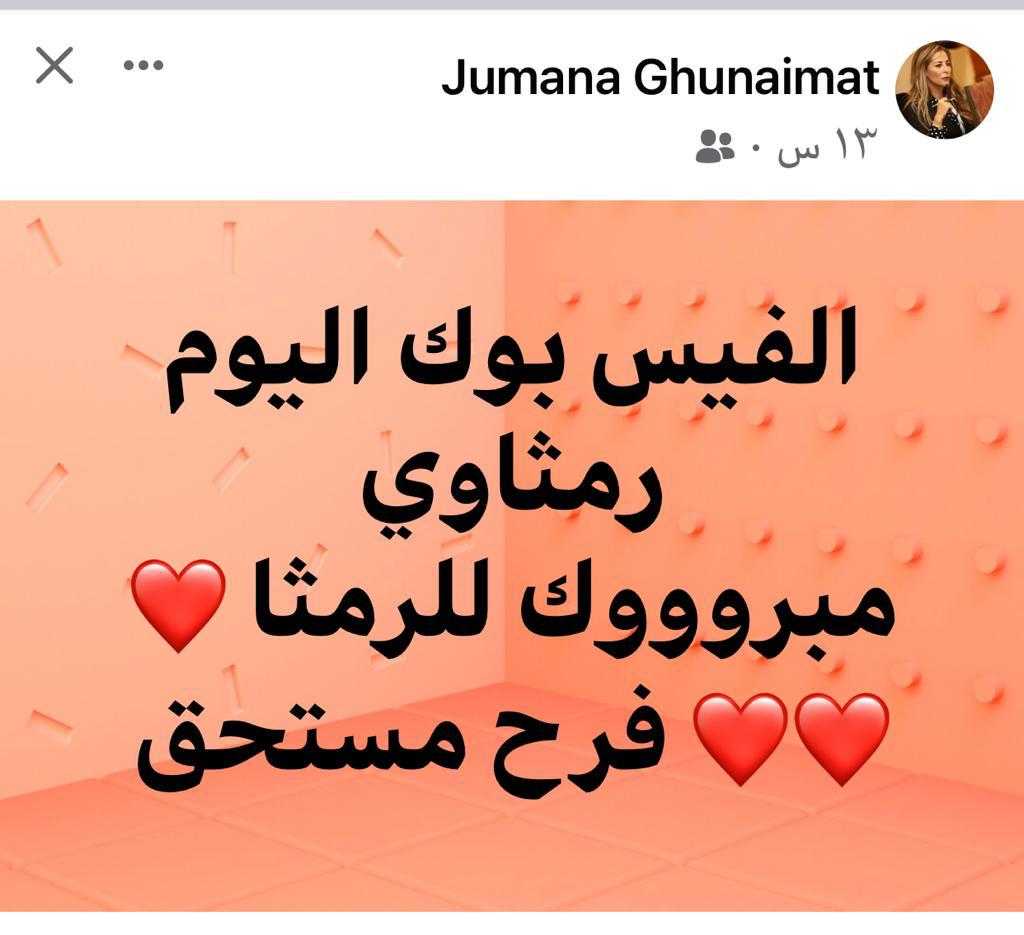 وقالت غنيمات في إدراج لها عبر فيسبوك "الفيسبوك اليوم رمثاوي. مبروك للرمثا. فوز مستحق".
