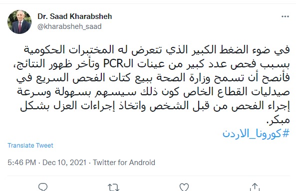 وقال الخرابشة في تغريدة له عبر تويتر، "في ضوء الضغط الكبير الذي تتعرض له المختبرات الحكومية بسبب فحص عدد كبير من عينات الPCR وتأخر ظهور النتائج، فأنصح أن تسمح وزارة الصحة ببيع كتات الفحص السريع في صيدليات القطاع الخاص كون ذلك سيسهم بسهولة وسرعة إجراء الفحص من قبل الشخص واتخاذ إجراءات العزل بشكل مبكر".
