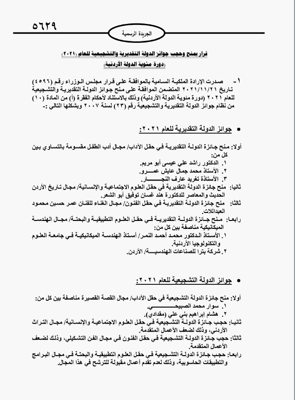 القبة نيوز- صدرت الارادة الملكية السامية بالموافقة على قرار مجلس الوزراء المتضمن الموافقة على منح جوائز الدولة التقديرية والتشجيعية للعام 2021 (دورة مئوية الدولة الأردنية).