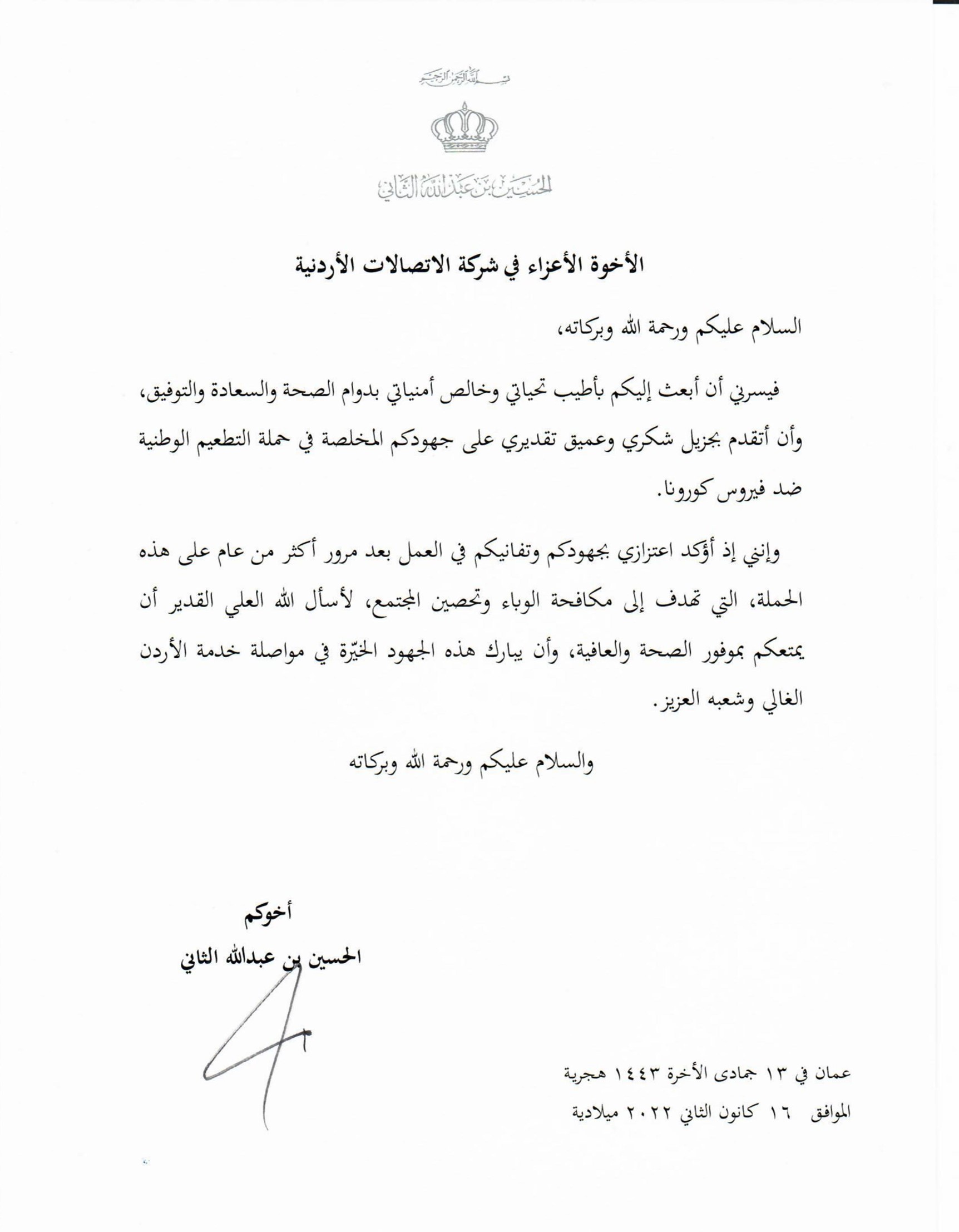 تلقّت أورنج الأردن كتاب شكر من صاحب السمو الملكي ولي العهد الأمير الحسين بن عبدالله الثاني تقديراً للجهود التي بذلتها الشركة في حملة التطعيم الوطنية ضد فيروس كورونا.