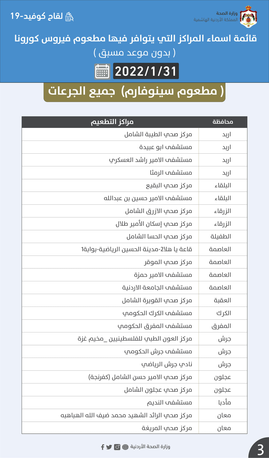 الصحة تعلن مراكز التطعيم الاثنين