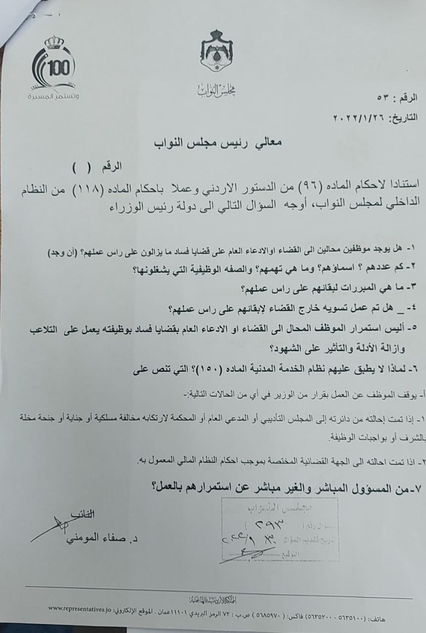 القبة نيوز - وجهت النائب الدكتورة صفاء المومني أربعة أسئلة الى الحكومة، تمحورت حول موظفين محالين الى القضاء على قضايا فساد، وقيمة المبالغ المرصودة في وزارة المالية للنفقات الطارئة.