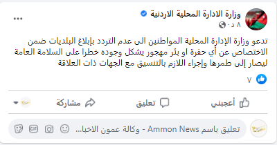 وأكدت الوزارة في ادراج لها عبر فيسبوك أنه سيتم طمر أي بئر مهجور او حفرة مخالفة وإجراء اللازم بالتنسيق مع الجهات ذات العلاقة.