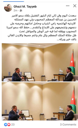 وقال الطيب في ادارج له عبر فيسبوك، "سعدت اليوم وفي ثاني أيام الشهر الفضيل بلقاء سمو الأمير الحسين بن عبدالله المعظم المحبوب ولي عهد المملكة الاردنية الهاشمية راعي الشباب وحامل امانتهم وحرصه على دعمهم وتشجيعهم على الابداع والتقدم. حفظ الله سمو اميرنا المحبوب ووفقه لما فيه خير الوطن والمواطن تحت ظل جلالة الملك المعظم وكل عام وانتم جميعا والأردن الغالي بألف خير وبركة".