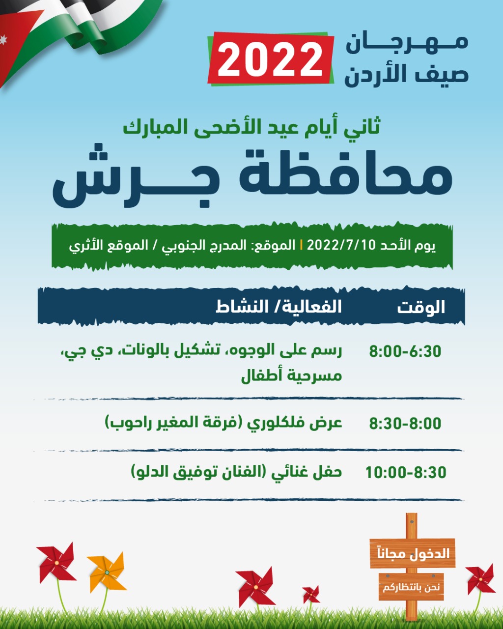 وفيما يلي البرنامج التّفصيلي للأنشطة والفعاليّات المتنوعة التي ستُقام في جميع محافظات المملكة ثاني يوم من عيد الأضحى المبارك: