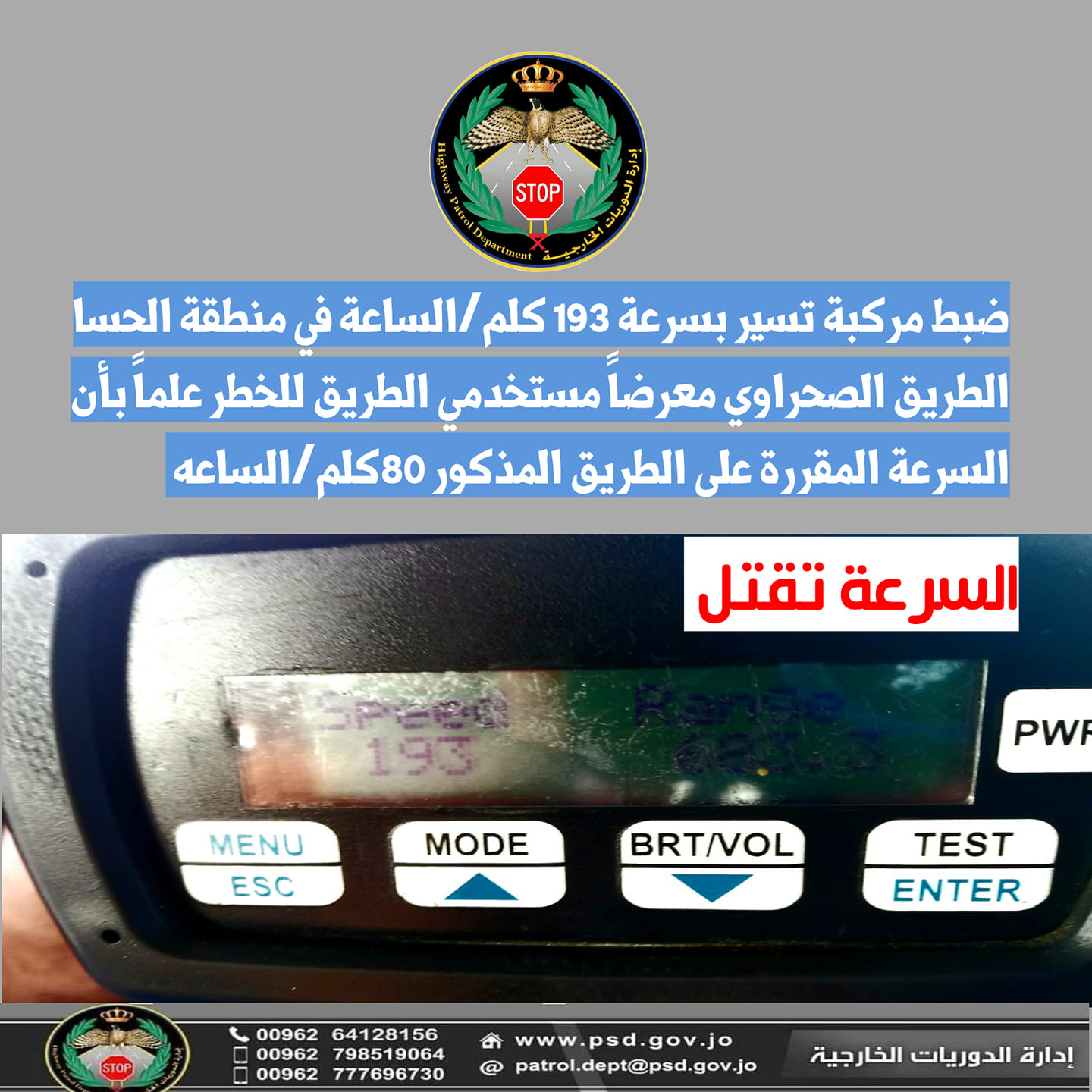 القبة نيوز- أعلنت إدارة الدوريات الخارجية الجمعة، عن ضبط مركبة تسير بسرعة 193 كلم/س في منطقة الحسا على الطريق الصحراوي.