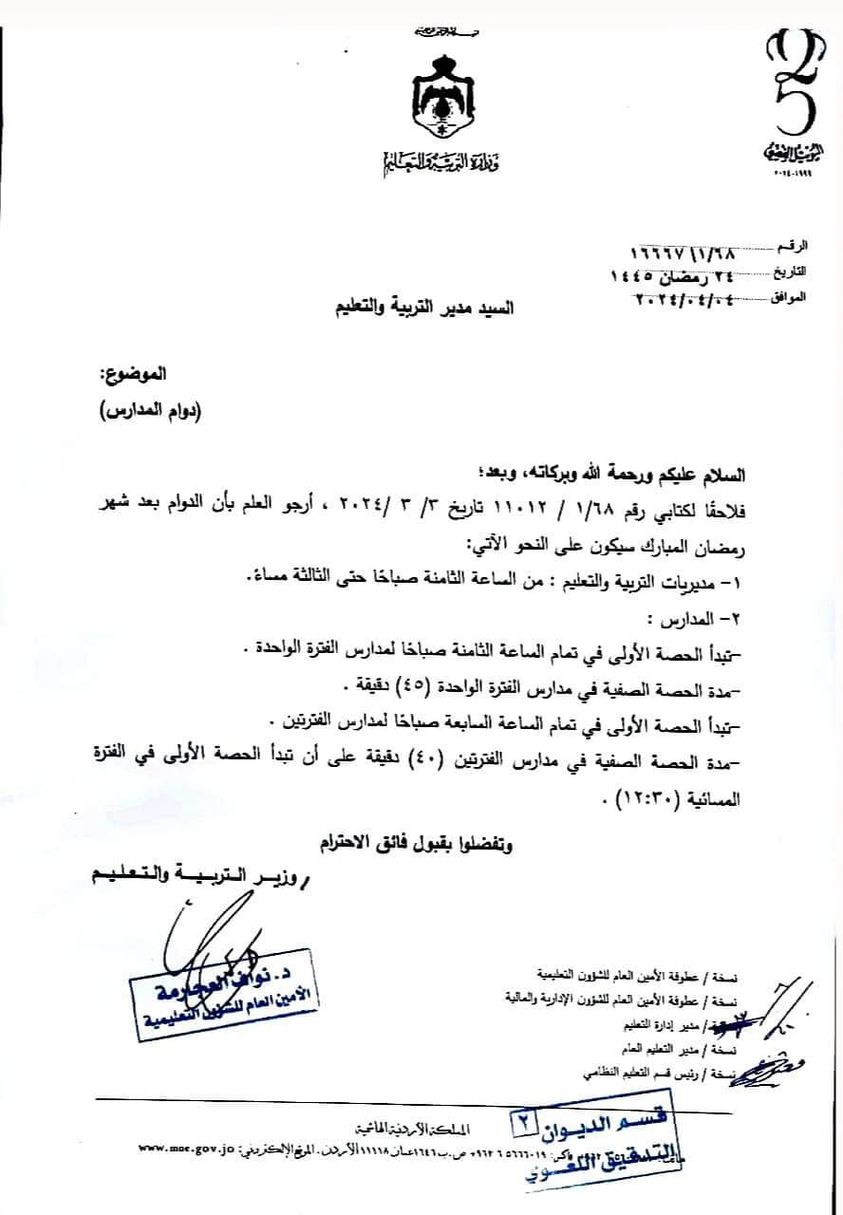 القبة نيوز - أصدر أمين عام وزارة التربية والتعليم للشؤون الاكاديمية الدكتور نواف العجارمة، تعميمًا لمدراء التربية والتعليم في مختلف محافظات المملكة حول دوام المدارس بعد عيد الفطر السعيد.