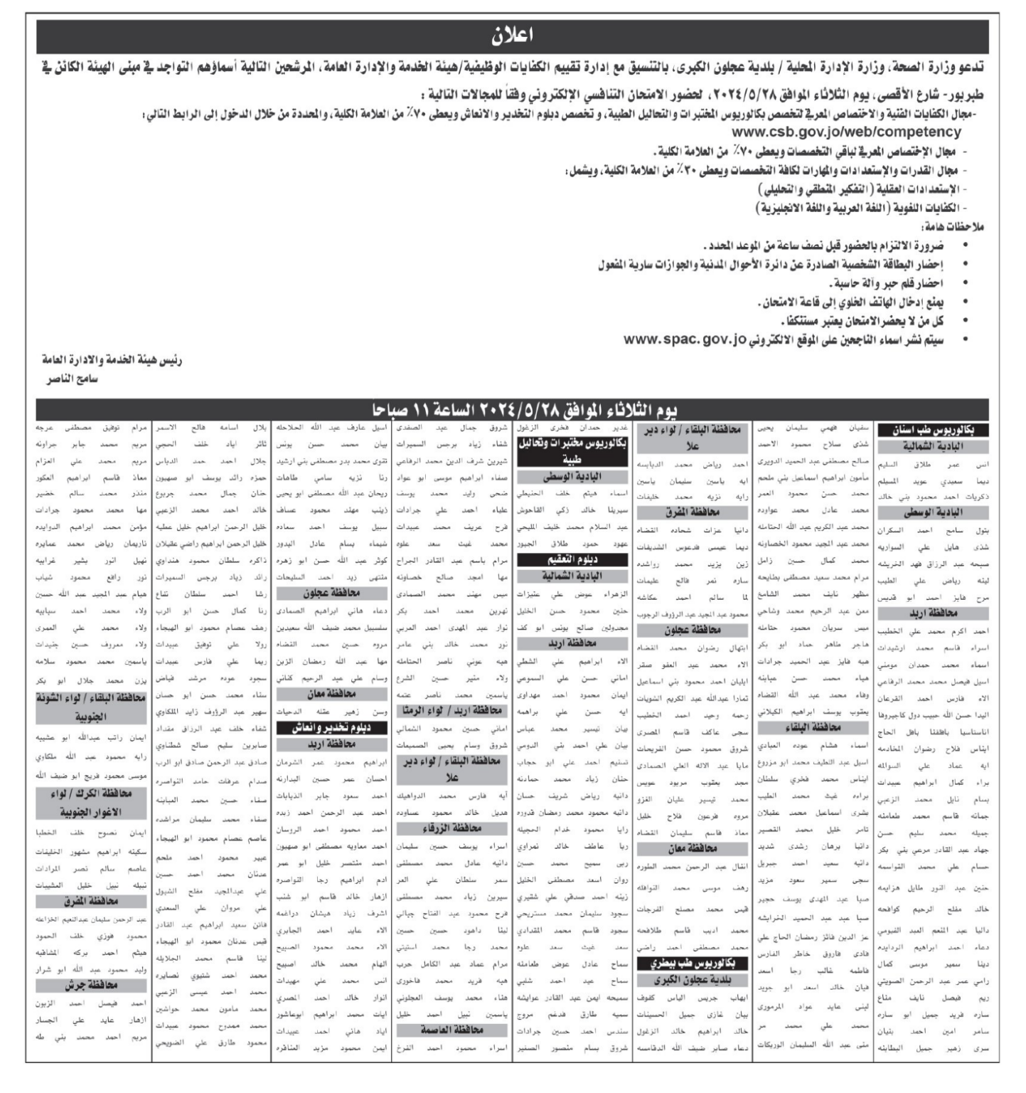 القبة نيوز - دعت وزارة الصحة، ووزارة الإدارة المحلية/ بلدية عجلون الكبرى، وبالتنسيق مع إدارة تقييم الكفايات الوظيفية/ هيئة الخدمة والإدارة العامة، مرشحين لحضور الامتحان التنافسي الإلكتروني.