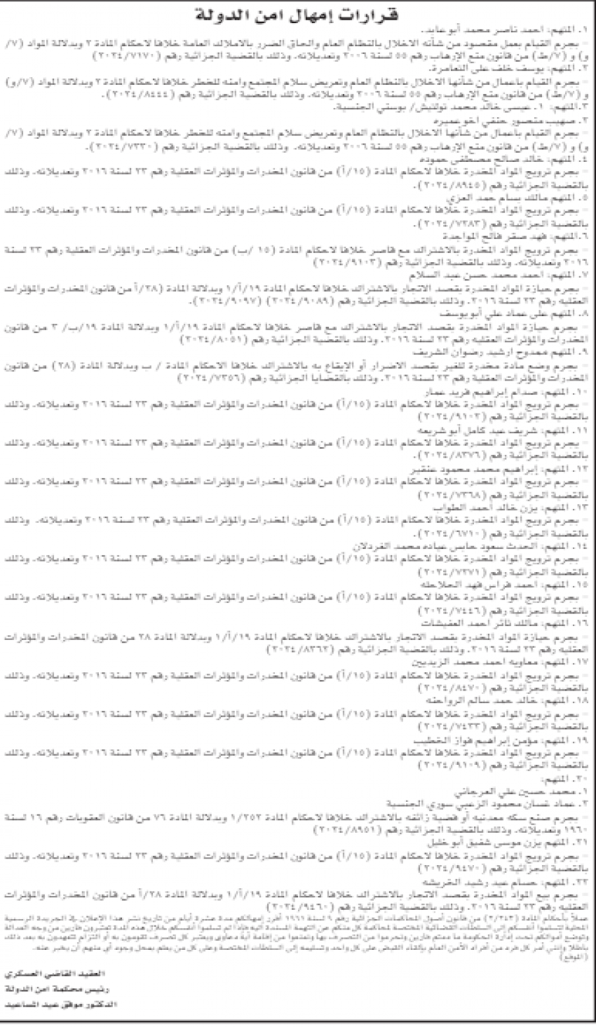 ونشرت المحكمة، أسماء المتهمين، عملا بأحكام المادة 243 /2 من قانون أصول المحاكمات الجزائية رقم 9 لسنة 1961.