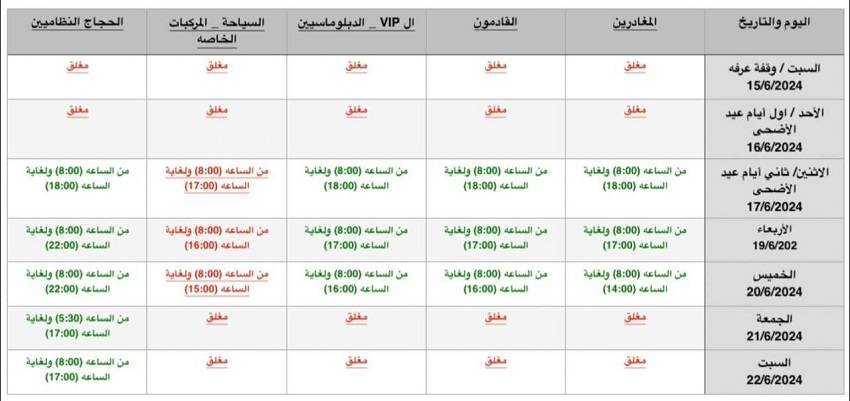وقالت الإدارة إن عمل الجسر سيكون مغلقا السبت 2024/6/15، كذلك سيكون الجسر مغلقا أمام حركة جميع المسافرين والشحن الأحد 2024/6/16 أول أيام عيد الأضحى المبارك.