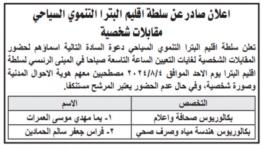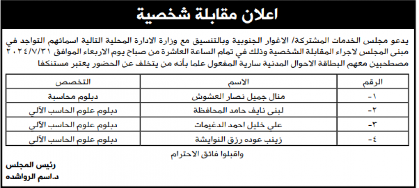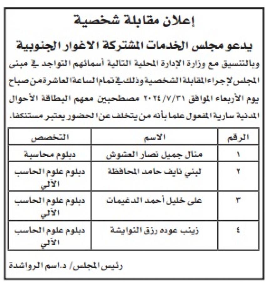 القبة نيوز - دعت عدد من البلديات ومجالس خدمات ومؤسسات حكومية ،اليوم الاثنين، التالية اسماؤهم لاجراء المقابلات الشخصية لغايات التعيين.