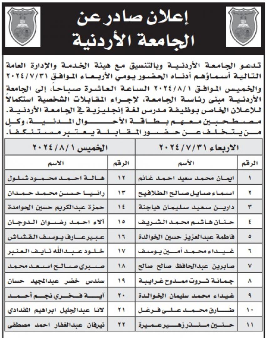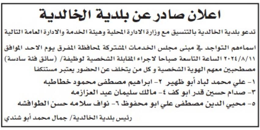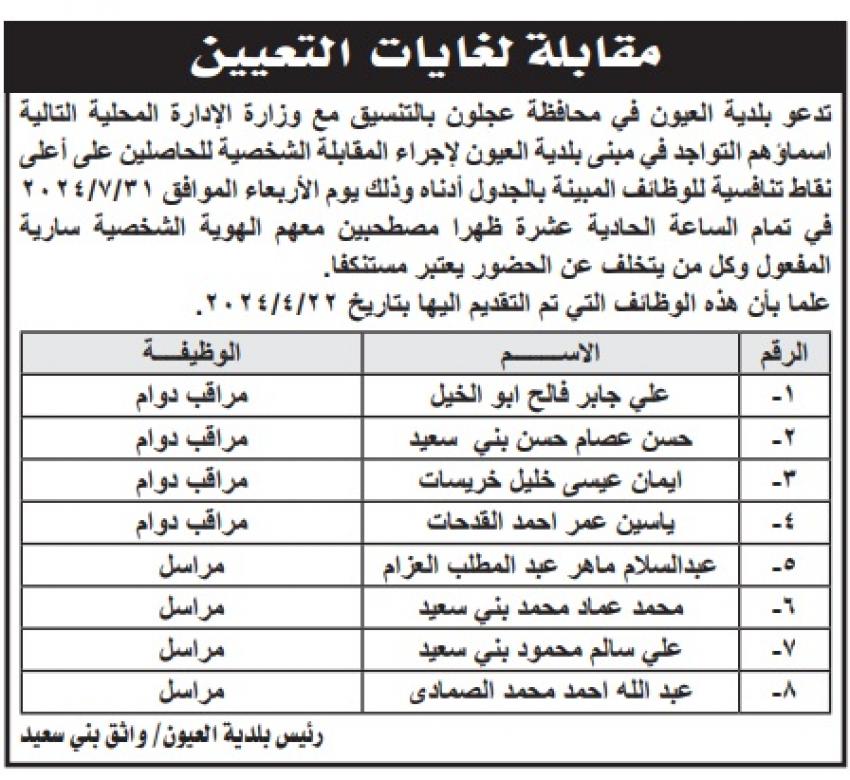 القبة نيوز - دعت عدد من البلديات ومؤسسات حكومية ،اليوم الثلاثاء، التالية اسماؤهم لاجراء المقابلات الشخصية لغايات التعيين.