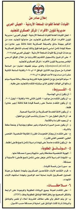 القبة نيوز-  أعلنت القيادة العامة للقوات المسلحة الأردنية - الجيش العربي اليوم الأحد، عن حاجتها لتجنيد عدد من الذكور بمهنة سائق بالصبغة العسكرية (فئة ثالثة/ جير عادي) من حملة شهادة الثامن الأساسي فما فوق.