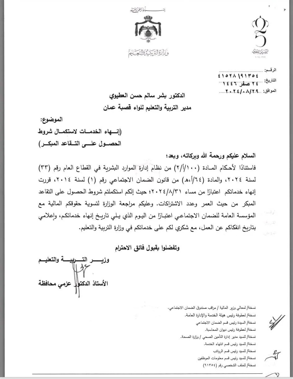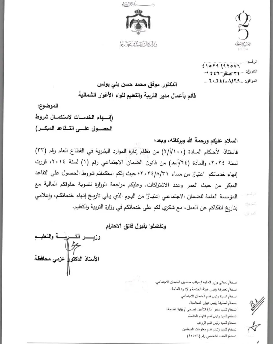 القبة نيوز- رر وزير التربية والتعليم الدكتور عزمي محافظة، اليوم الخميس إنهاء خدمات عدد من الموظفين بناء على طلبهم لاستكمالهم شروط الحصول على التقاعد المبكر من حيث العمر وعدد الاشتراكات.