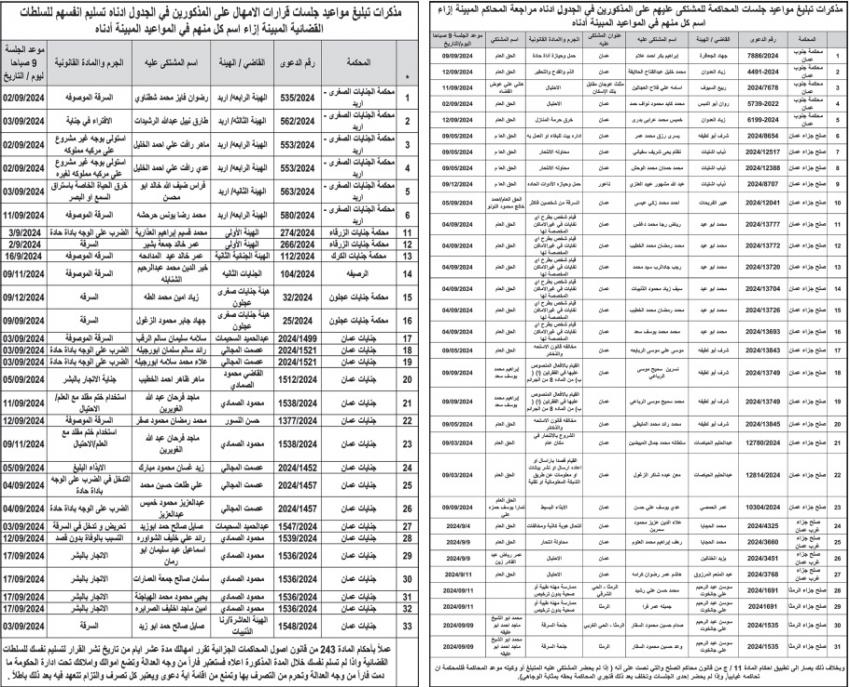 وطلبت المذكرات من المذكورين في الجداول مراجعة المحاكم المبينة ازاء اسم كل منهم في المواعيد المبينة أدناه.