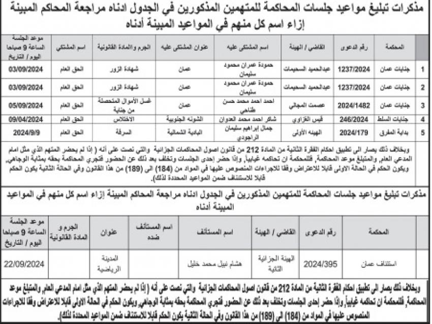 مذكرات تبليغ مواعيد جلسات محاكمة لأردنيين (أسماء)