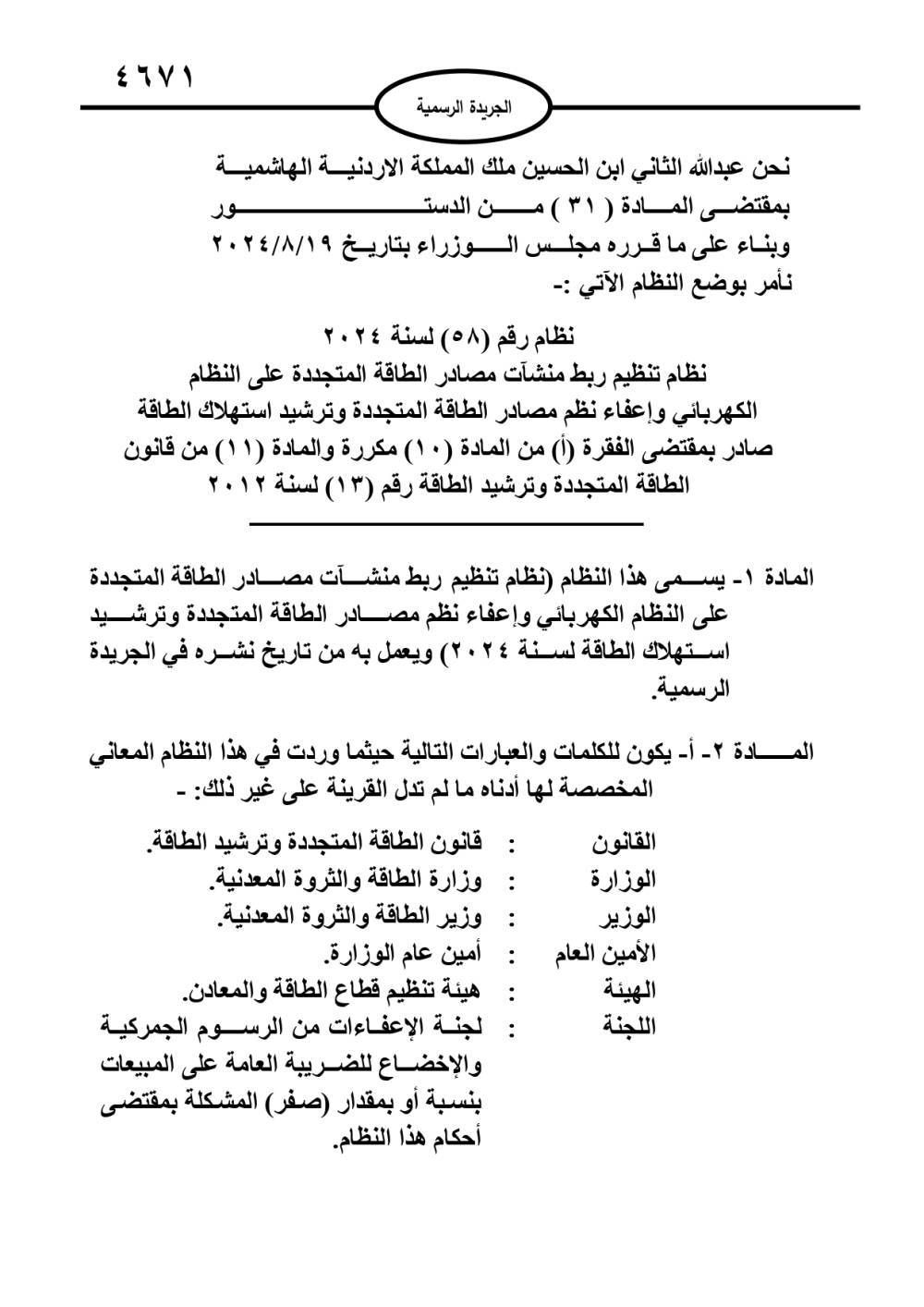 القبة نيوز - صدرت الإرادة الملكية السامية بوضع نظام تنظيم ربط منشآت مصادر الطاقة المتجددة على النظام الكهربائي وإعفاء نظم مصادر الطاقة المتجددة وترشيد استهلاك الطاقة.
