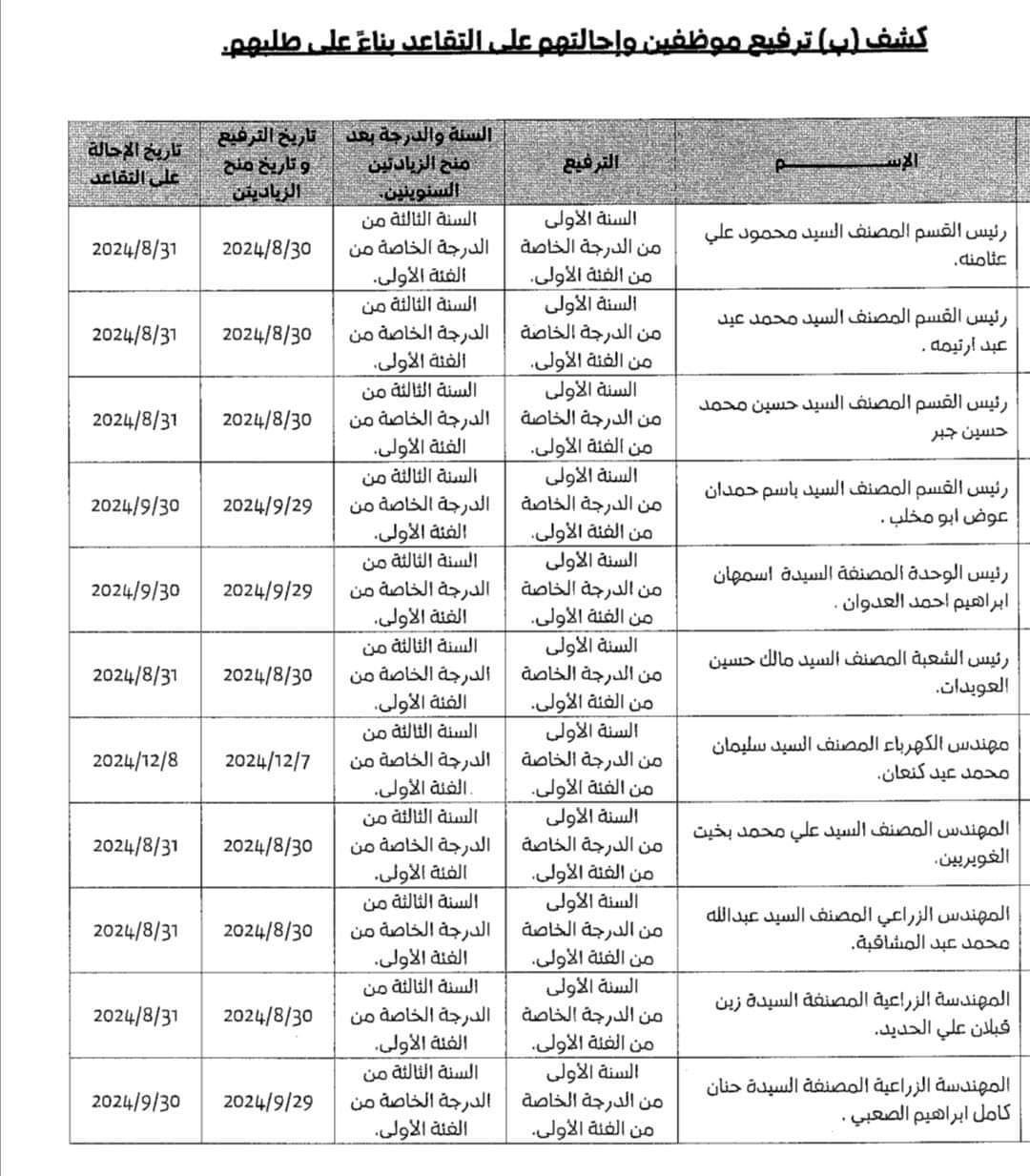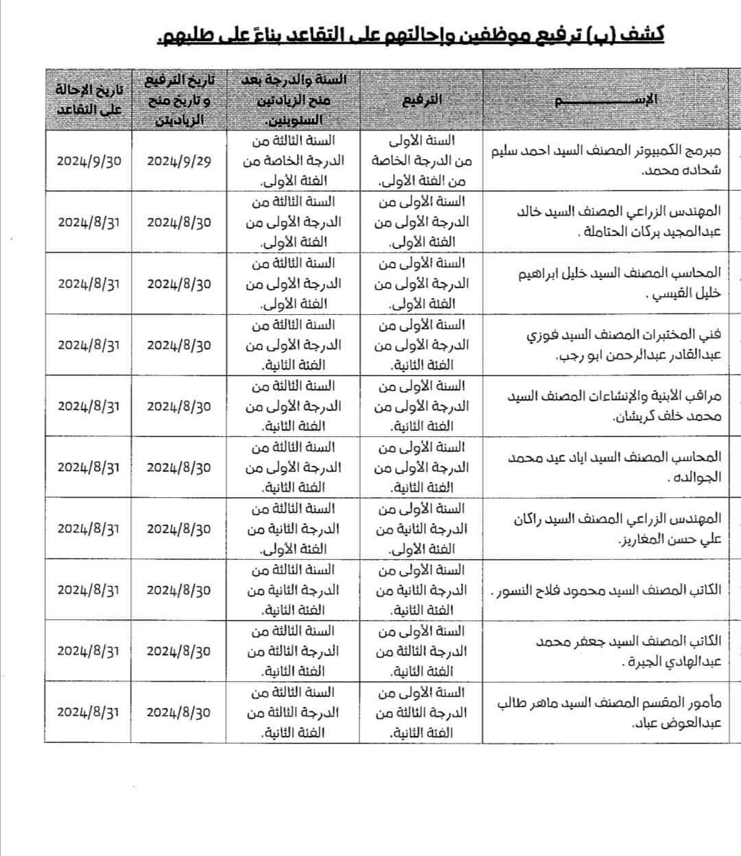 كما قرر ترفيع عدد من الموظفين الى السنة والدرجة الوظيفية وبالتاريخ المبين إزاء اسم كلا منهم واحالتهم الى التقاعد بناء على طلبهم