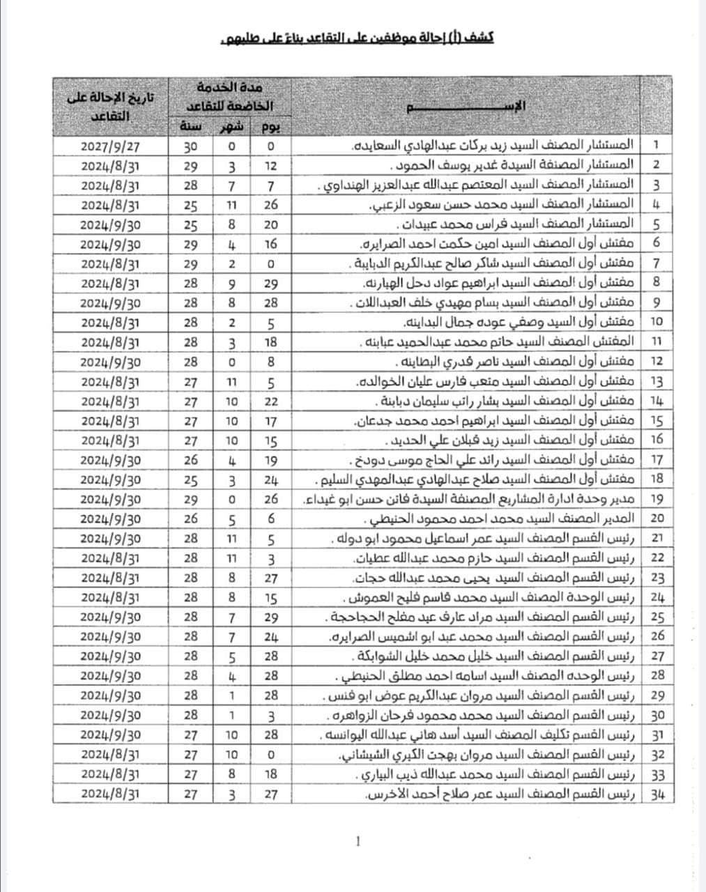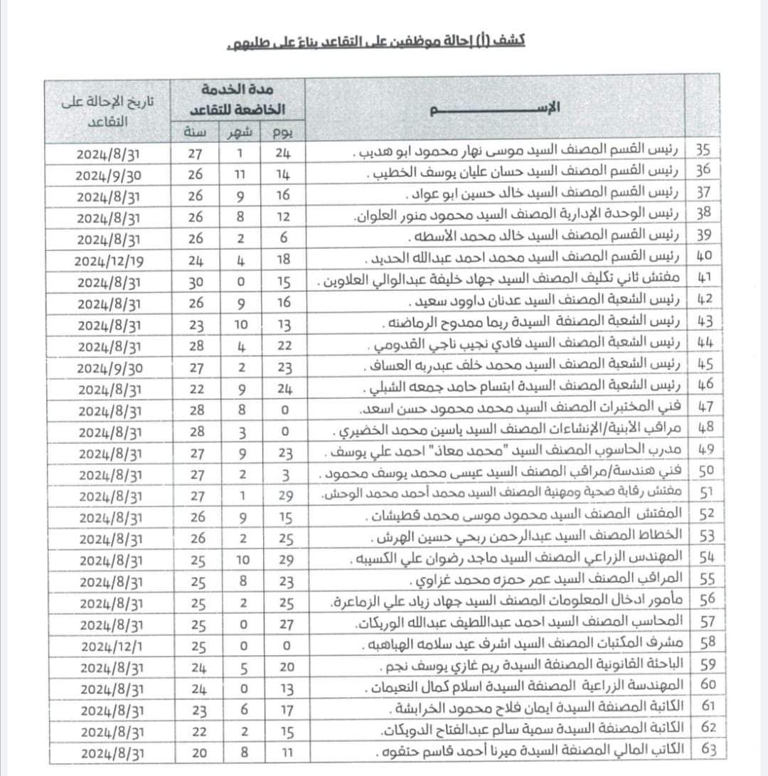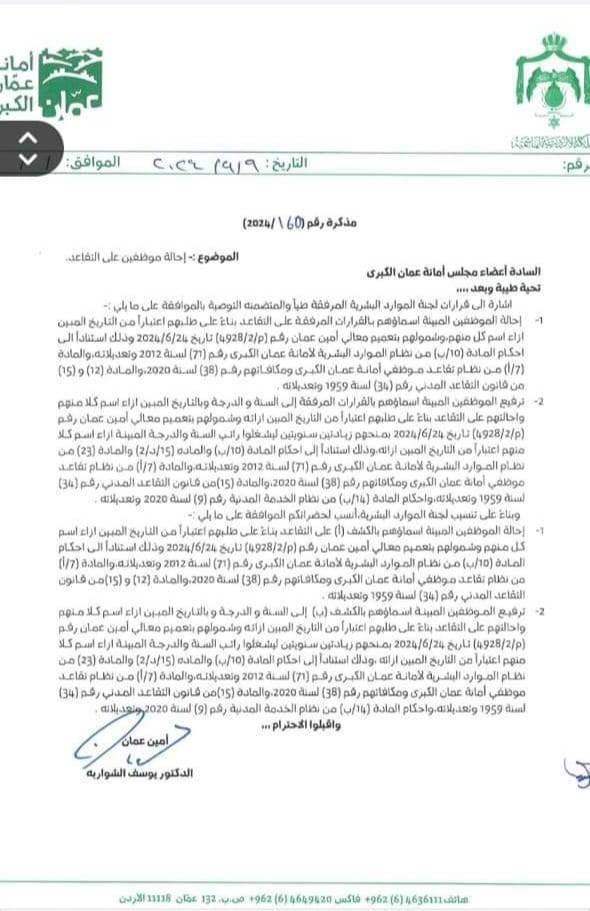 القبة نيوز  - نسّب أمين عمان الدكتور يوسف الشواربة، بإحالة مستشارين ورؤساء أقسام وموظفين المبينة أسماؤهم أدناه الى التقاعد بناء على طلبهم اعتبارا من التاريخ المبين زاء كل اسم منهم، وشمولهم باحكام المادة 10/ب من نظام الموارد البشرية لامانة عمان الكبرى رقم 71 لسنة 2024وتعديلاته والمادة 7/أ من نظام تقاعد موظفي الامانة ومكآفآتهم رقم 38 لسنة 2020 والمادة 12 و 15 من قانون التقاعد المدني رقم 34 لسنة 1959 وتعديلاته .
