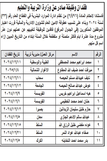 القبة نيوز-أعلنت وزارة التربية والتعليم ،الإثنين، عن فقدان عدد من موظفيها من مديريات مختلفة لوظائفهم، وذلك بسبب تغيبهم عن العمل لـ 10 ايام وأكثر ووفقا لاحكام القانون .