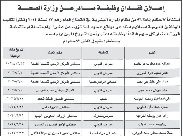القبة نيوز-  أعلنت وزارة الصحة ،الأحد، عن فقدان موظفين لوظائفهم، وذلك نظرا لتغيبهم عن مواقع عملهم لمدة تزيد عن 10 أيام متصلة أو متقطعة.