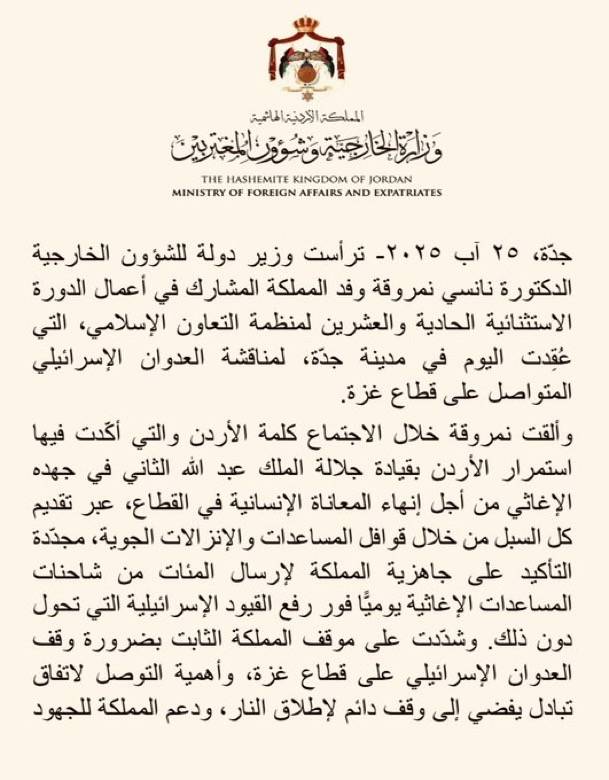 وألقت نمروقة كلمة المملكة، مؤكدة استمرار جهود الأردن بقيادة جلالة الملك عبد الله الثاني لتخفيف المعاناة الإنسانية في غزة، من خلال تقديم قوافل المساعدات والإنزالات الجوية، مشددة على جاهزية المملكة لإرسال المئات من شاحنات المساعدات فور رفع القيود الإسرائيلية. وشددت على موقف الأردن الثابت بضرورة وقف العدوان الإسرائيلي والتوصل لاتفاق تبادل يفضي إلى وقف دائم لإطلاق النار، ودعم الجهود القطرية والمصرية والأميركية في هذا الصدد.