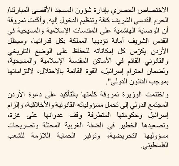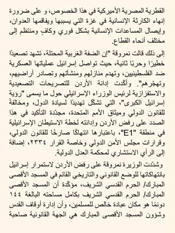 كما أكدت الوزيرة نمروقة أن الضفة الغربية المحتلة تشهد تصعيداً خطيراً، وعمليات عسكرية إسرائيلية تهدم المنازل والمرافق وتصادر الأراضي، مشددة على إدانة الأردن لخطة الاستيطان الإسرائيلية في منطقة "E1”، ورفضه للانتهاكات المستمرة للوضع القانوني والتاريخي للمسجد الأقصى/الحرم القدسي الشريف، مؤكدة أن الوصاية الهاشمية على المقدسات الإسلامية والمسيحية مسؤولية وطنية وأمانة يواصل الأردن الحفاظ عليها.