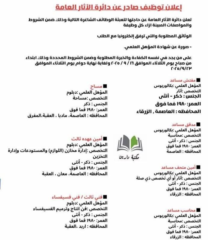 دائرة الآثار العامة تعلن عن وظائف شاغرة