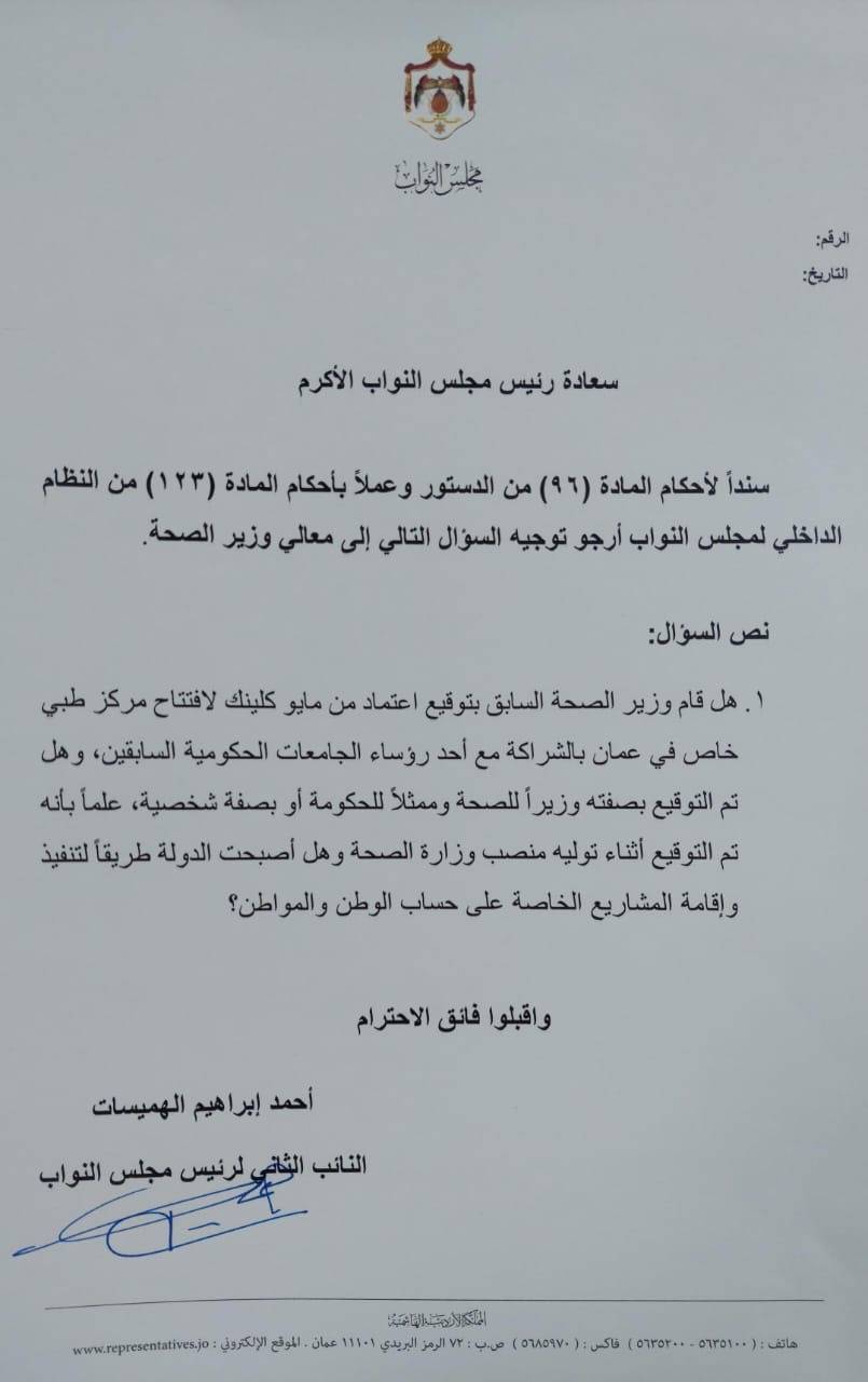 وتساءل الهميسات، في كتاب رسمي رفعه إلى رئاسة المجلس، عمّا إذا كان الوزير السابق قد وقّع اعتمادًا من مؤسسة "مايو كلينك” لافتتاح مركز طبي خاص في العاصمة عمان، بالشراكة مع أحد رؤساء الجامعات الحكومية السابقين، وهل تم التوقيع بصفته الرسمية كوزير للصحة وممثلًا للحكومة، أم بصفته الشخصية.