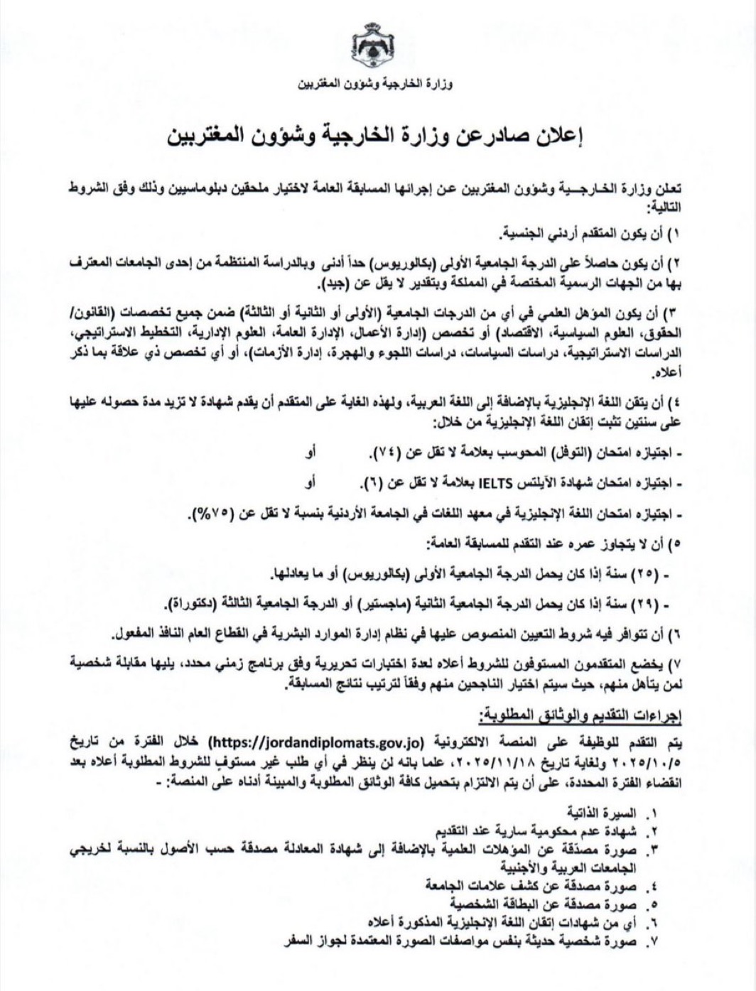 القبة نيوز - أعلنت وزارة الخارجية وشؤون المغتربين عن إطلاق المسابقة العامة لاختيار ملحقين دبلوماسيين، داعية الراغبين إلى التسجيل عبر المنصة الإلكترونية المخصصة: https://jordandiplomats.gov.jo/