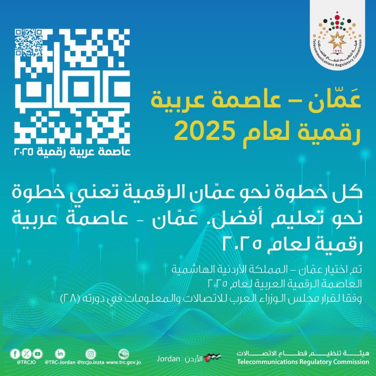 القبة نيوز - تم اختيار العاصمة الأردنية عمّان لتكون العاصمة الرقمية العربية لعام 2025، وذلك بناءً على قرار مجلس الوزراء العرب للاتصالات والمعلومات في دورته الثامنة والعشرين.