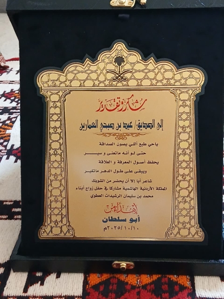 القبة نيوز - كرمت قبيلة بني عطية - عشيرة الرشيدات- في المملكة العربية السعودية الشاعر الاردني عيد صبحي العمارين