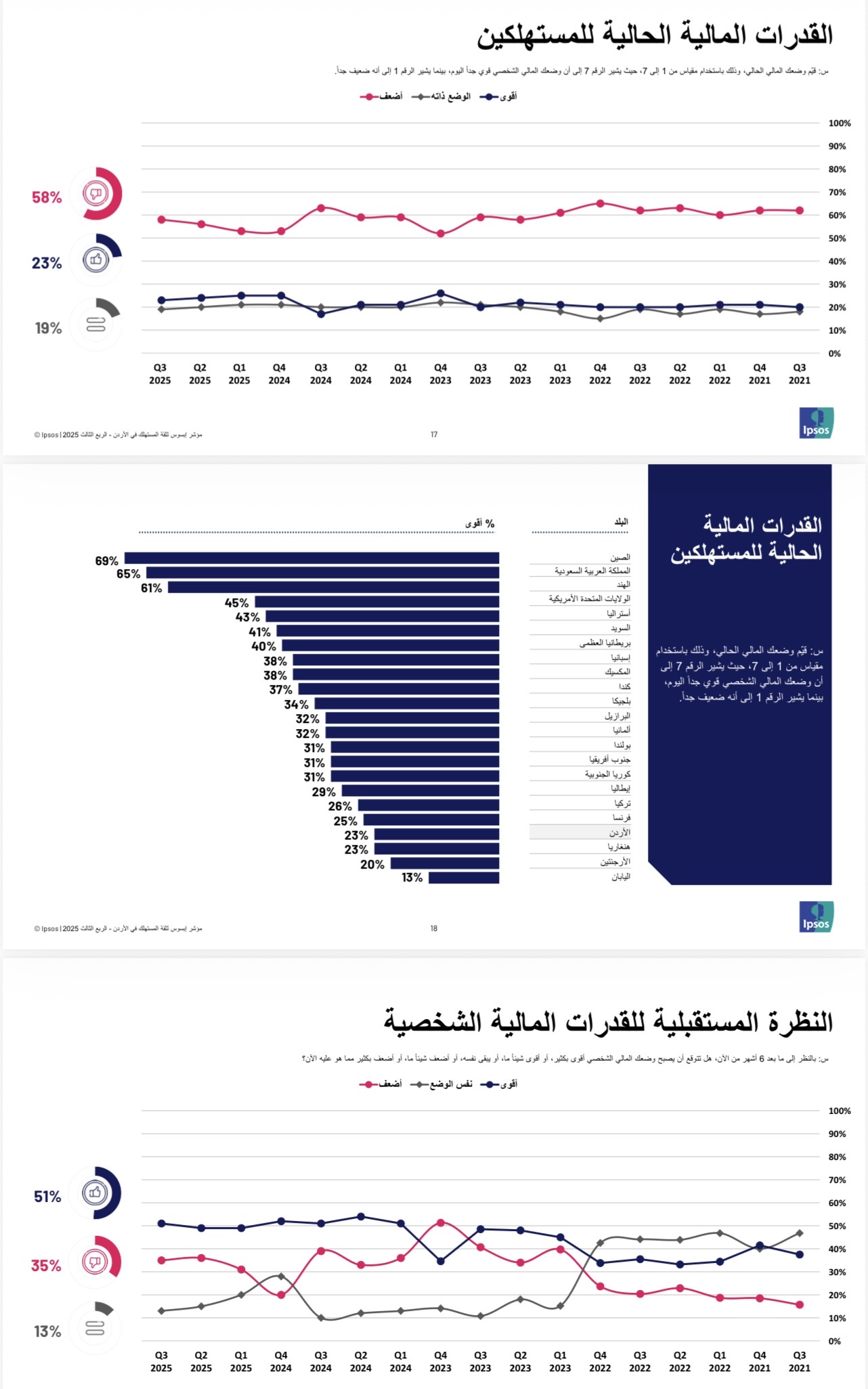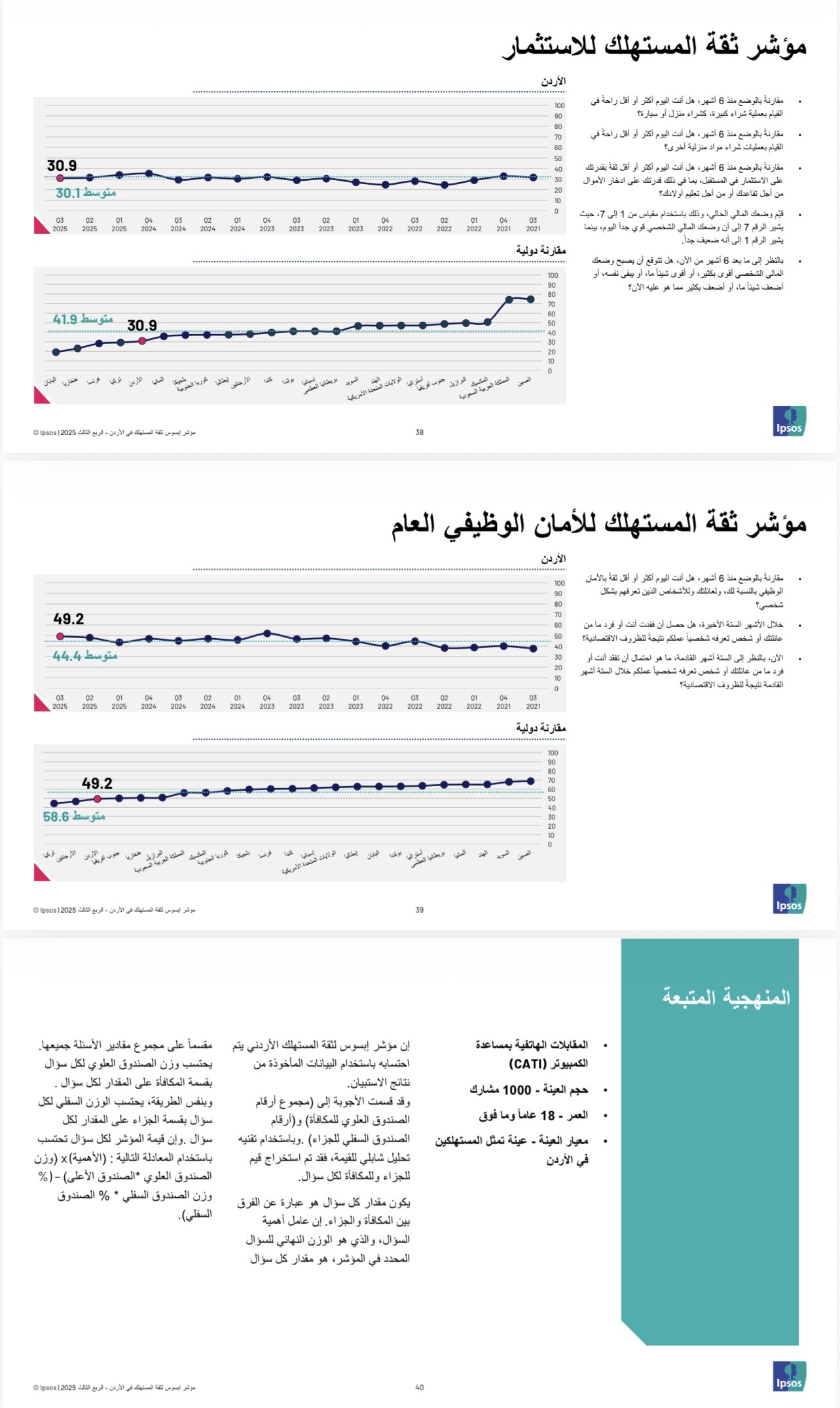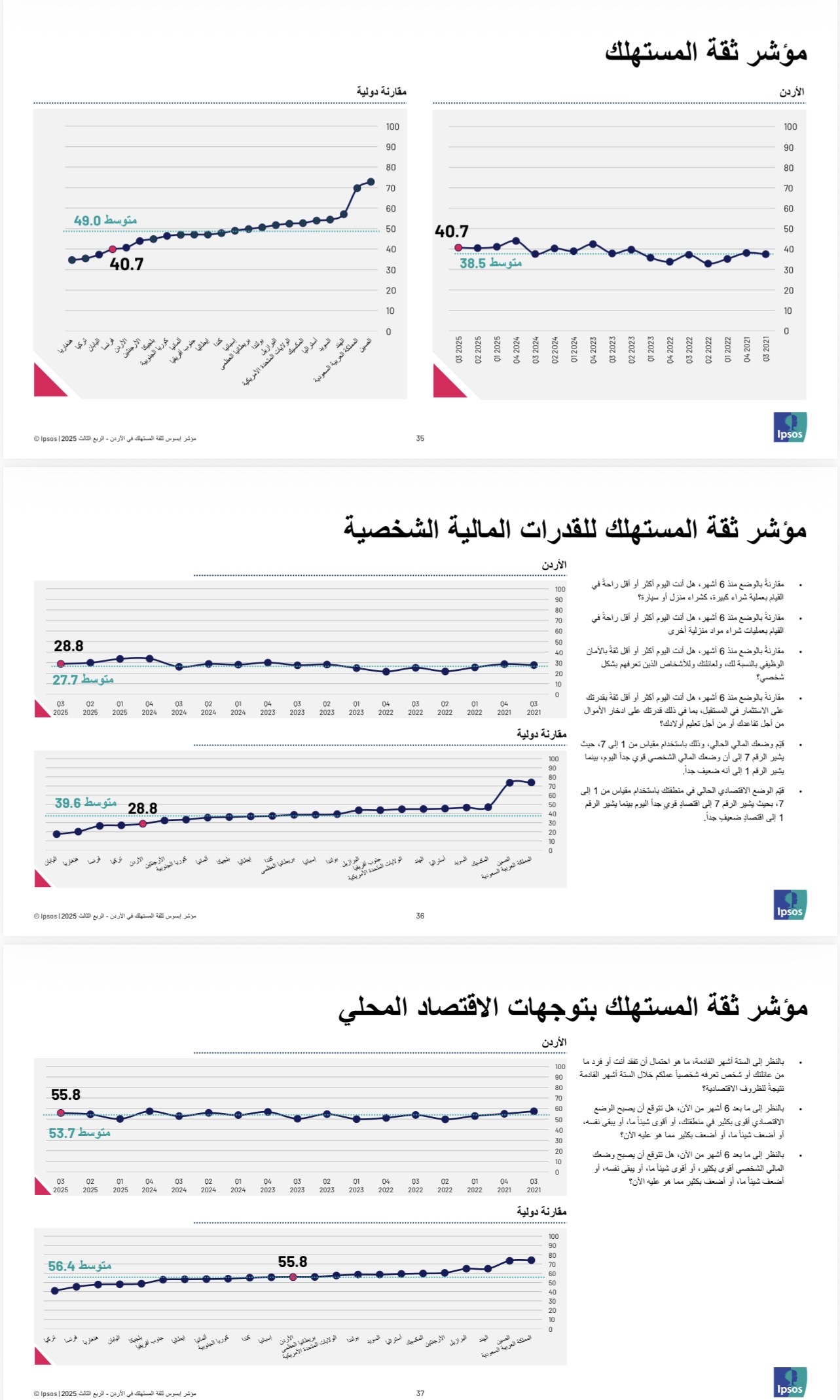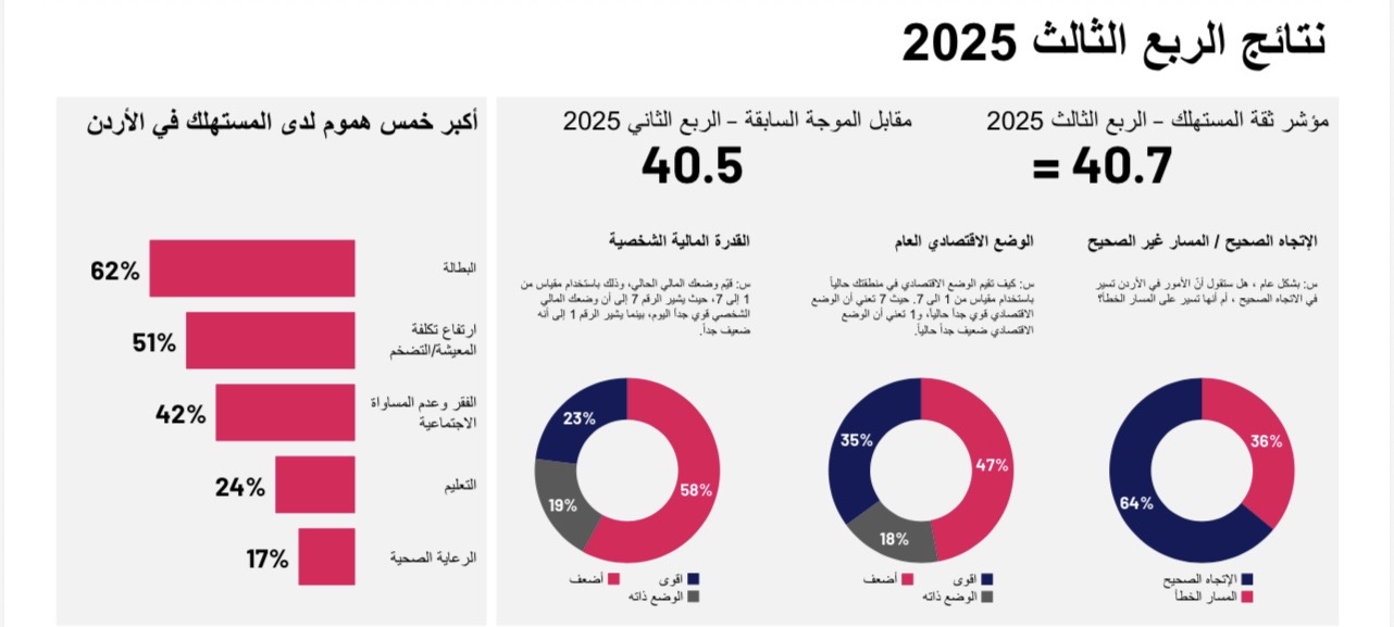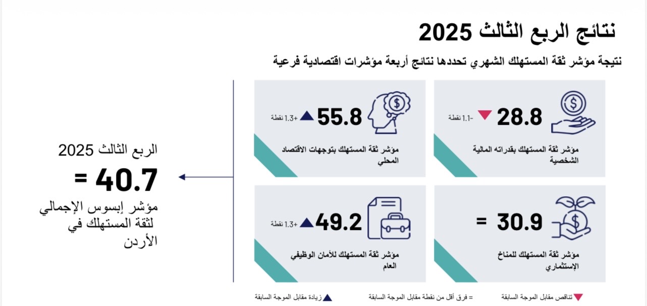 • سجل مؤشر ثقة المستهلك في الأردن للربع الثالث 2025 40.7 نقطة، مقارنة بـ 40.5 نقطة في الربع الثاني من العام نفسه.