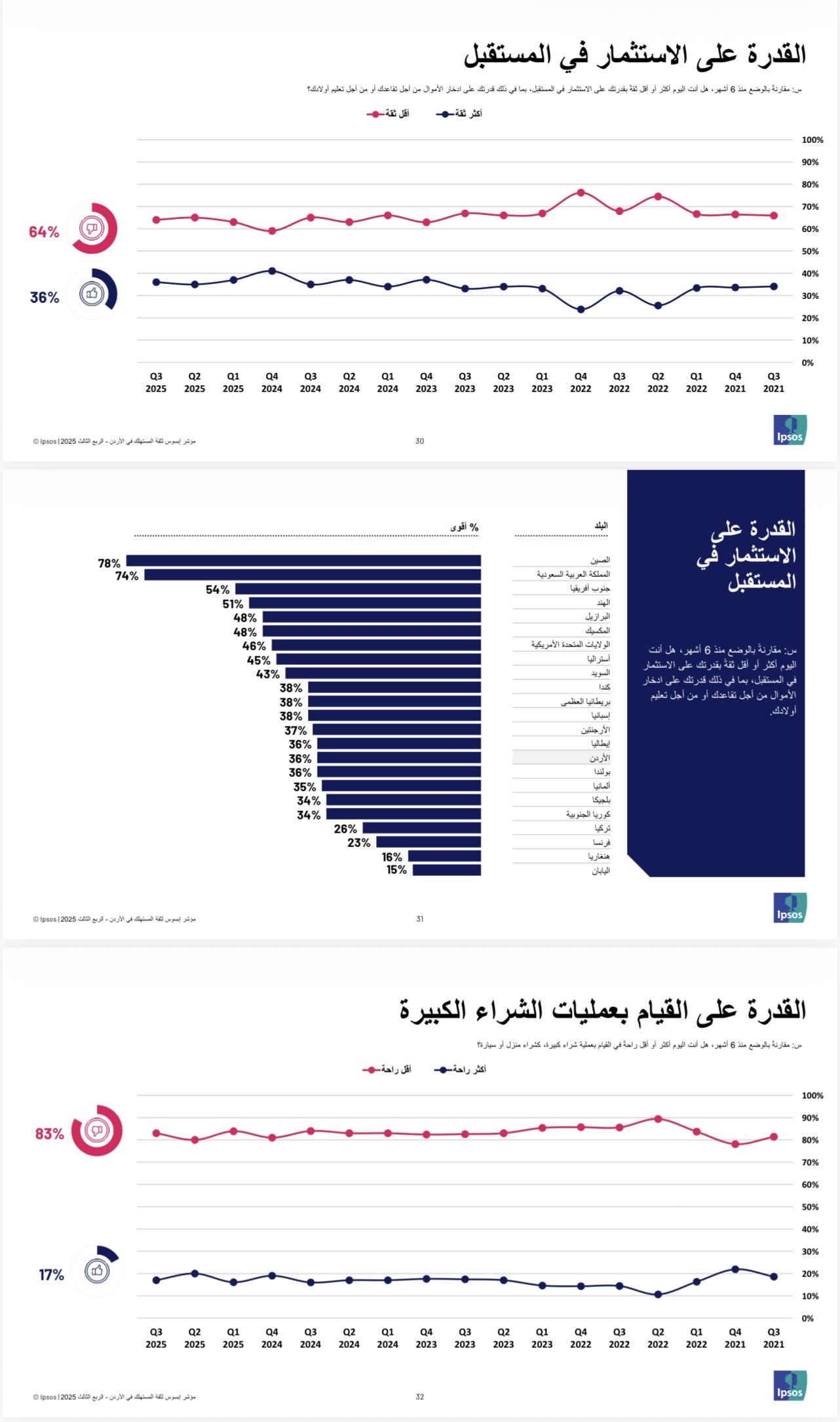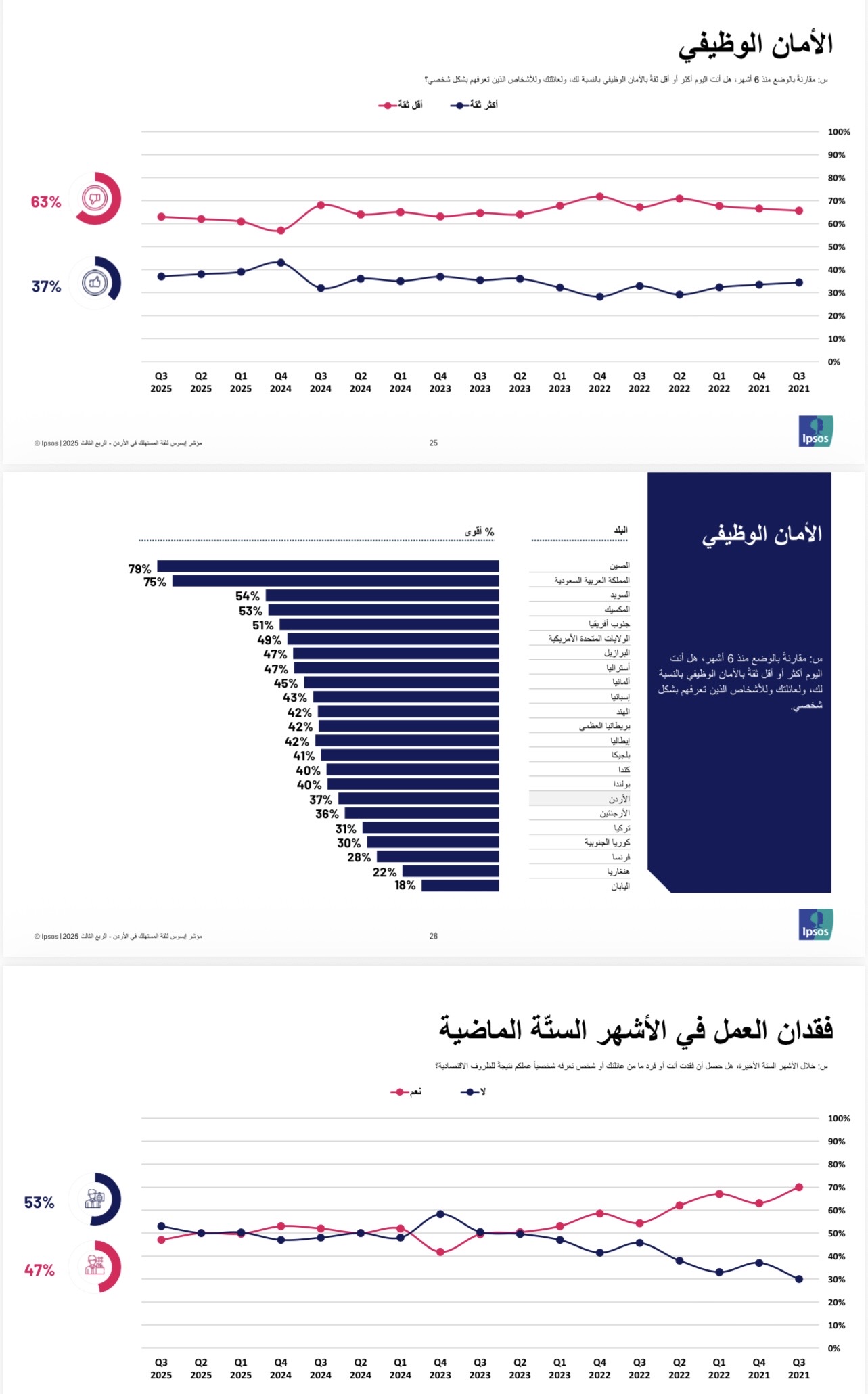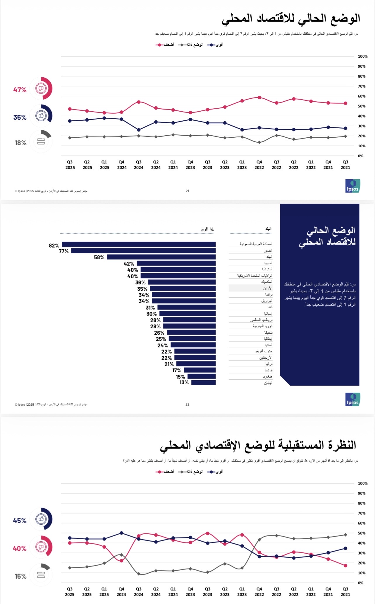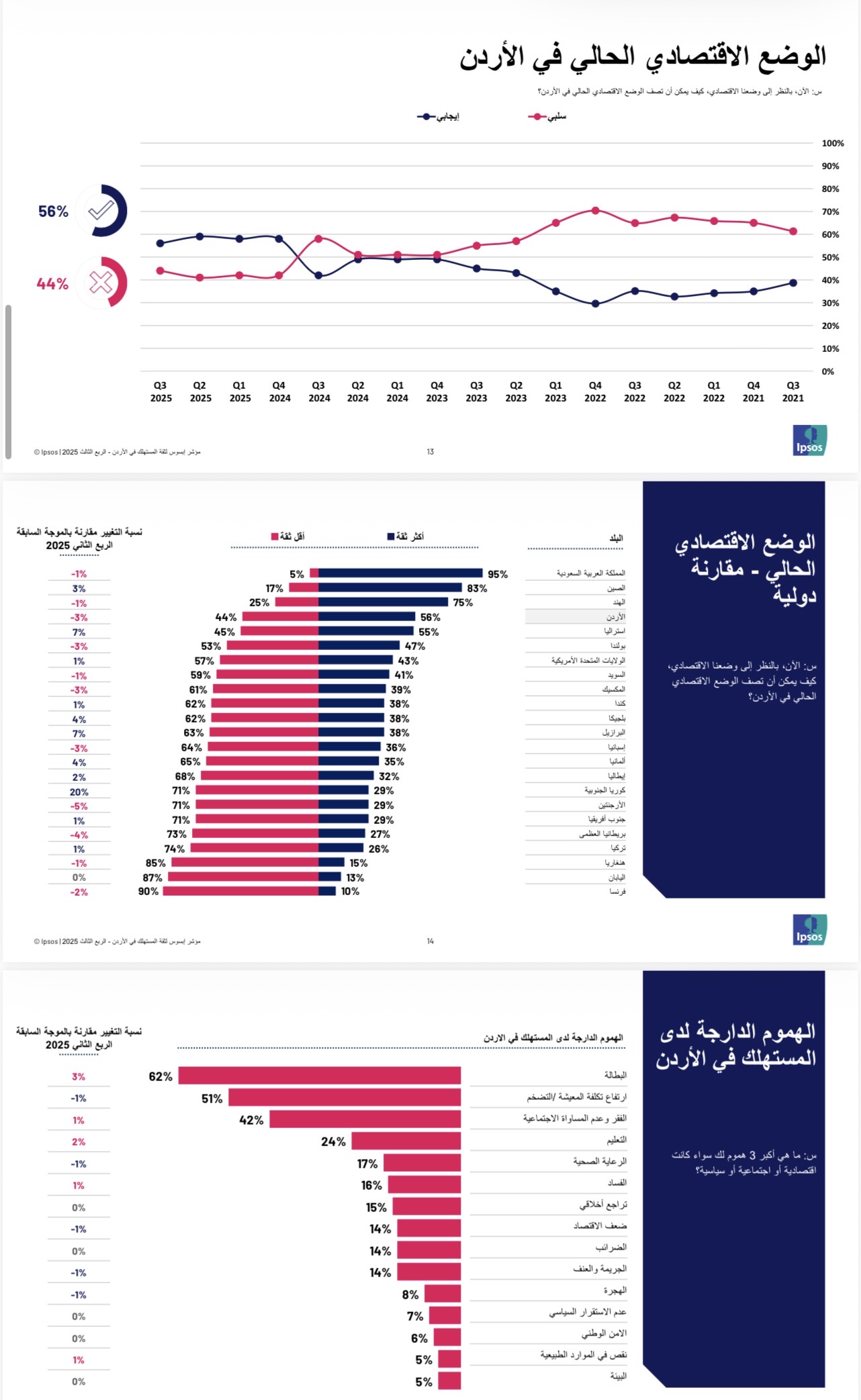 القبة نيوز - عمّان – أصدرت شركة إبسوس تقريرها الفصلي حول مؤشر ثقة المستهلك في الأردن للربع الثالث من عام 2025، والذي تم جمع بياناته خلال شهر أيلول، ويعكس آراء المواطنين حول الوضع الاقتصادي المحلي، والقدرات المالية الشخصية، والأمان الوظيفي، والمناخ الاستثماري، إضافة إلى أبرز همومهم وتوقعاتهم المستقبلية.