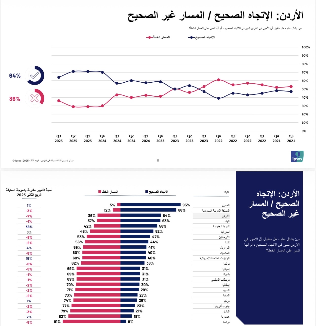 • 64% من الأردنيين يرون أن الأمور تسير على المسار الخطأ، مقابل 36% يرون أنها تسير في الاتجاه الصحيح.