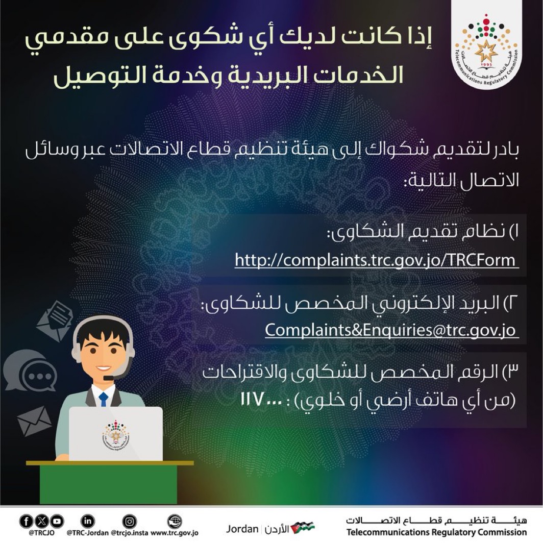 هيئة تنظيم قطاع الاتصالات تدعو المواطنين لتقديم الشكاوى عبر وسائل الاتصال الرسمية